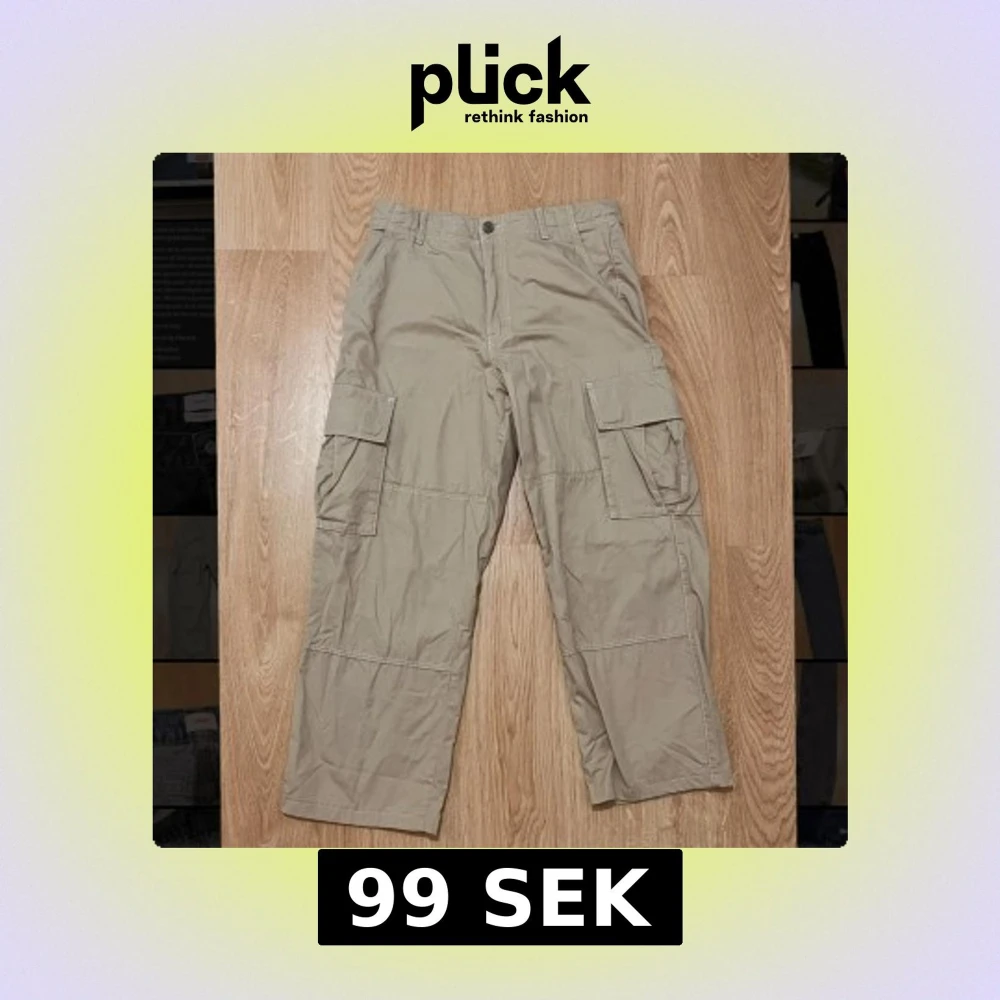 Snygga beiga cargobyxor från H&M med flera stora fickor på sidorna och bak. Byxorna har rak passform och är tillverkade i bomull. Använda några gånger.