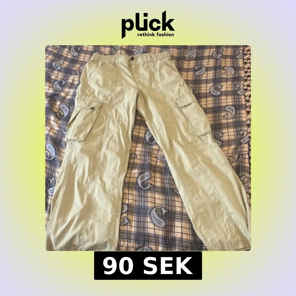 Snygga beiga cargobyxor från H&M i storlek 42. Byxorna har flera stora fickor på sidorna och resår i midjan för extra komfort. Tillverkade i 100% bomull, perfekta för en avslappnad och cool stil.