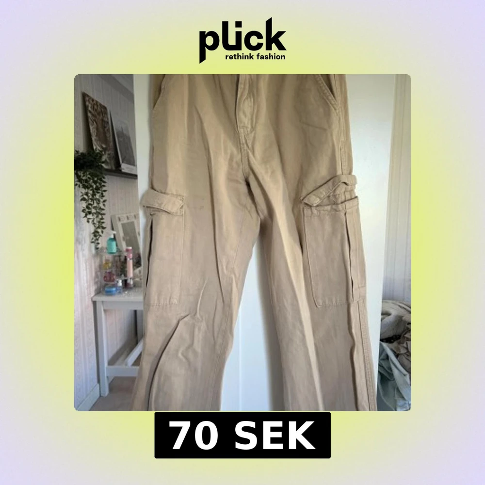 Säljer ett par beiga cargobyxor från Pull&Bear. Byxorna har flera fickor på sidorna och en rak passform. Perfekta för en avslappnad och trendig stil. Modellen är Tall och passar dig som vill ha lite extra längd.