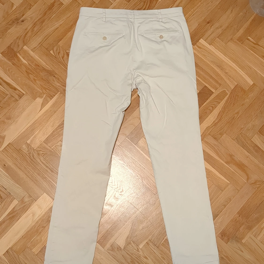 Snygga beiga chinos med slim fit. Byxorna har fickor fram och bak med knappstängning bak. Perfekta för en clean och stilren look. Materialet är mjuk och skön bomull. W31L31