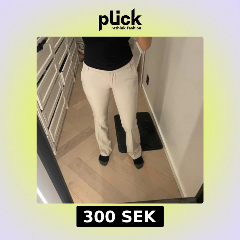 Snygga beiga kostymbyxor från BikBok i storlek 34. Byxorna har hög midja, raka ben med lätt bootcut och klassiska fickor både fram och bak.