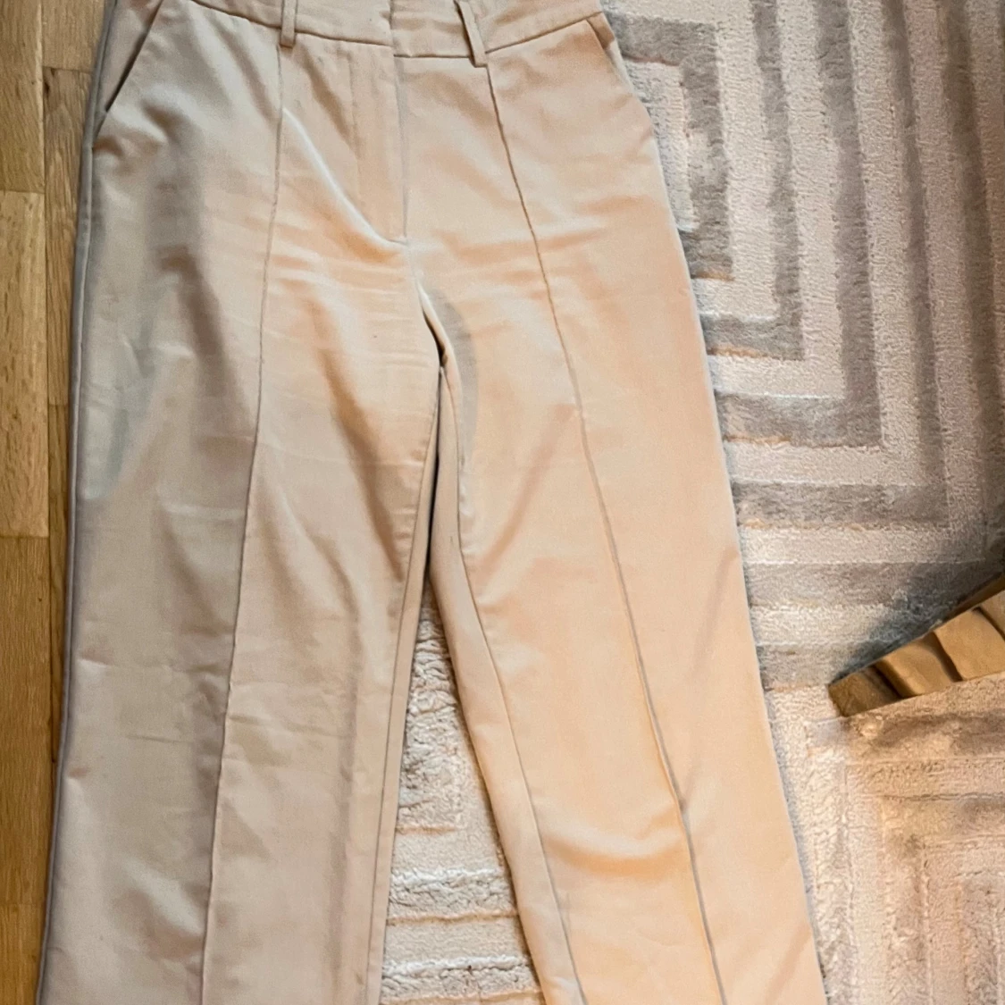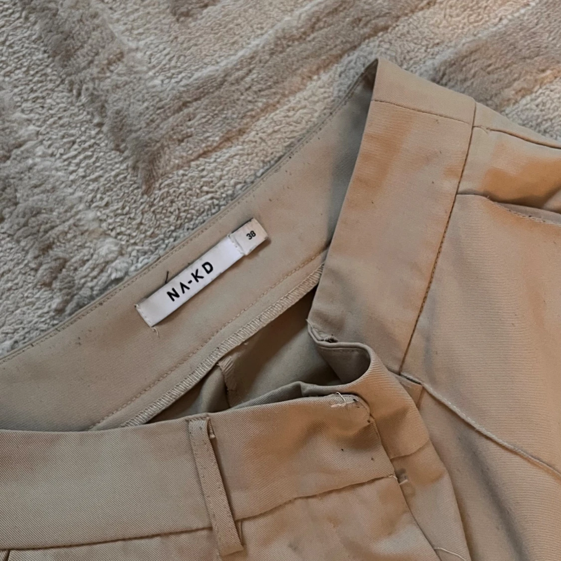 Stilrena beiga kostymbyxor från NA-KD med pressveck och hällor för bälte. Byxorna har rak passform och är tillverkade i ett mjukt bomullsmaterial. Perfekta för en clean och snygg look.