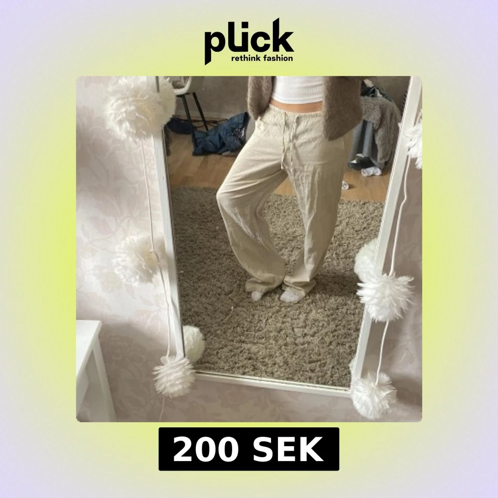 Snygga och luftiga beiga linnebyxor med rak passform. Perfekta för varmare dagar och ger en chill vibe. Byxorna har elastisk midja och är tillverkade i ett tunt, svalt linnematerial. Linne byxorna är även helt oanvända då lappen fortfarande sitter kvar💕