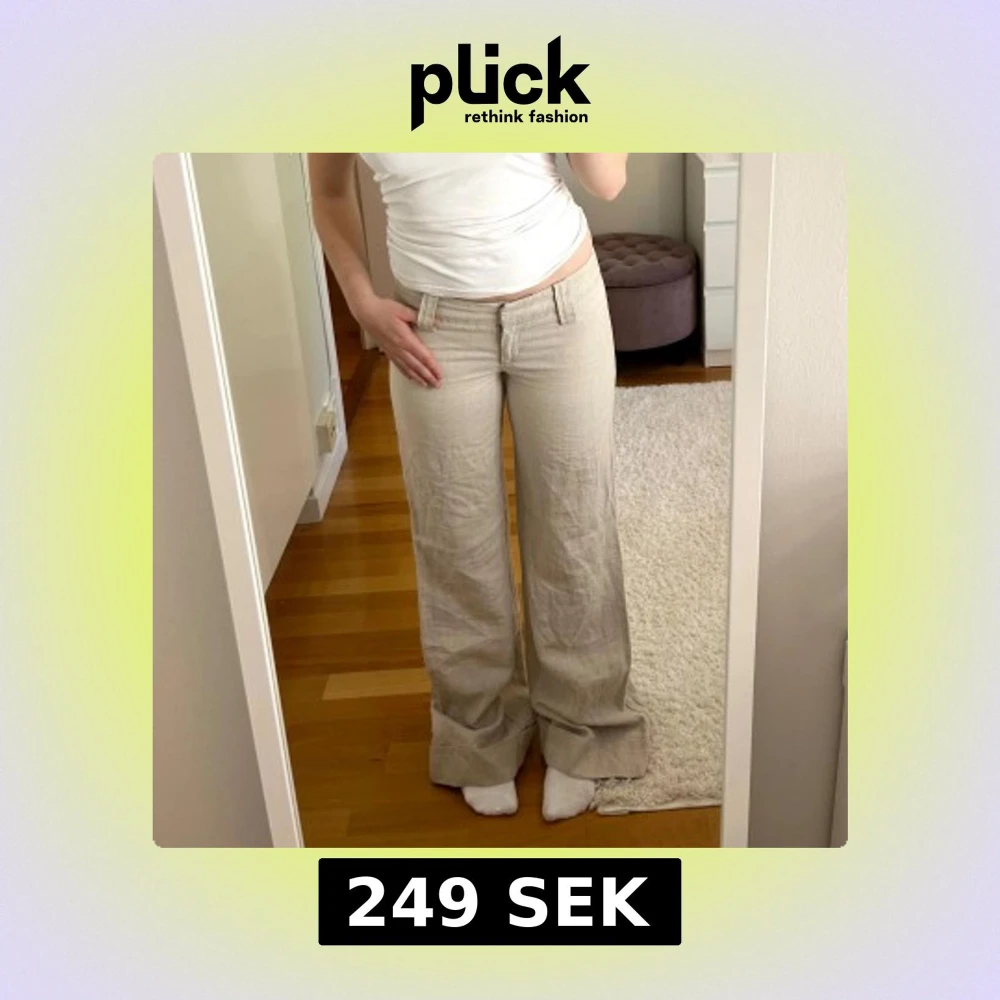 Super snygga beiga linnebyxor med låg midja och utsvängda ben. Storlek 36 och nyskick. (Passar någon längre än mig, 160cm)