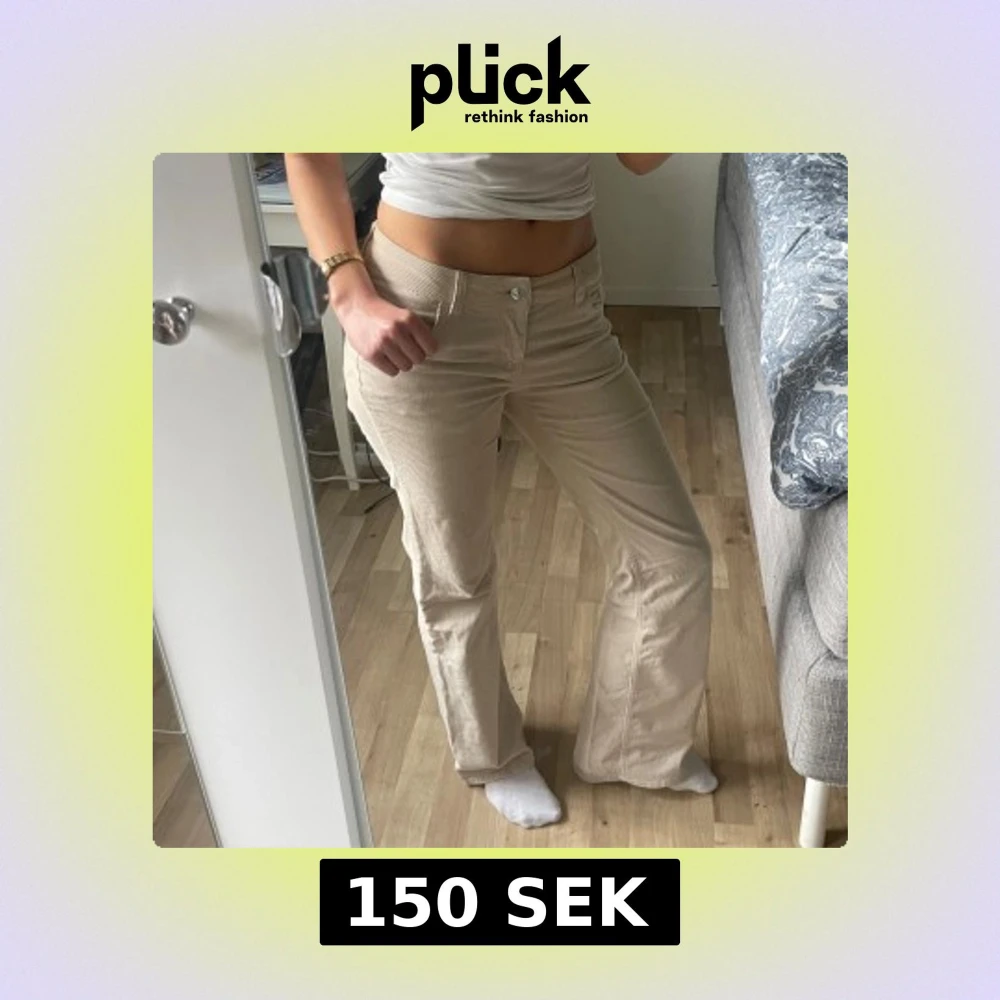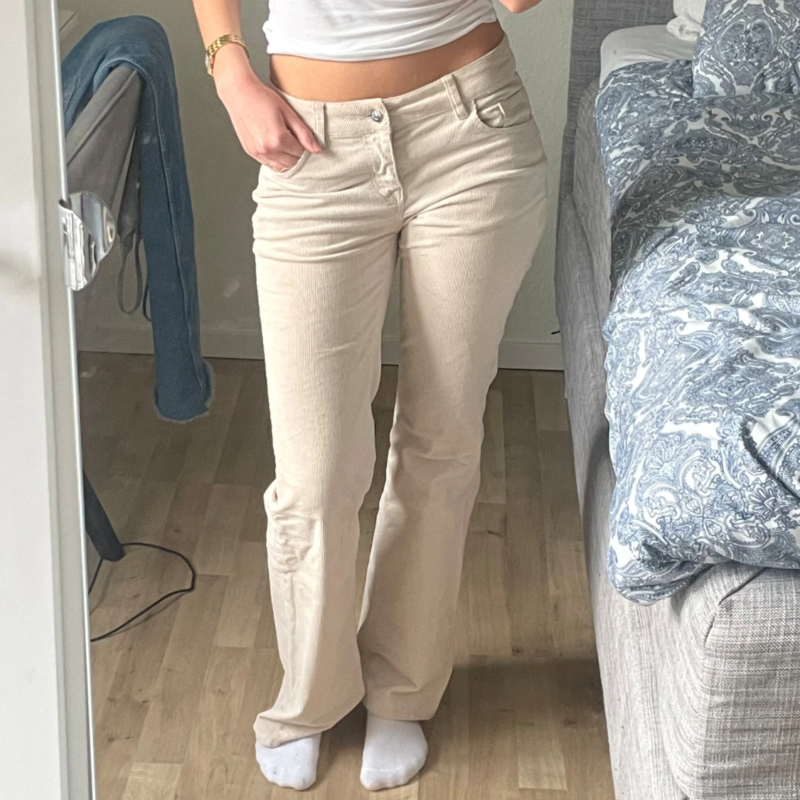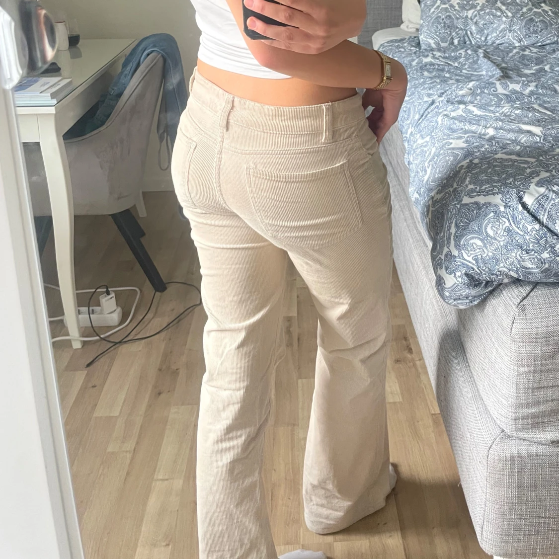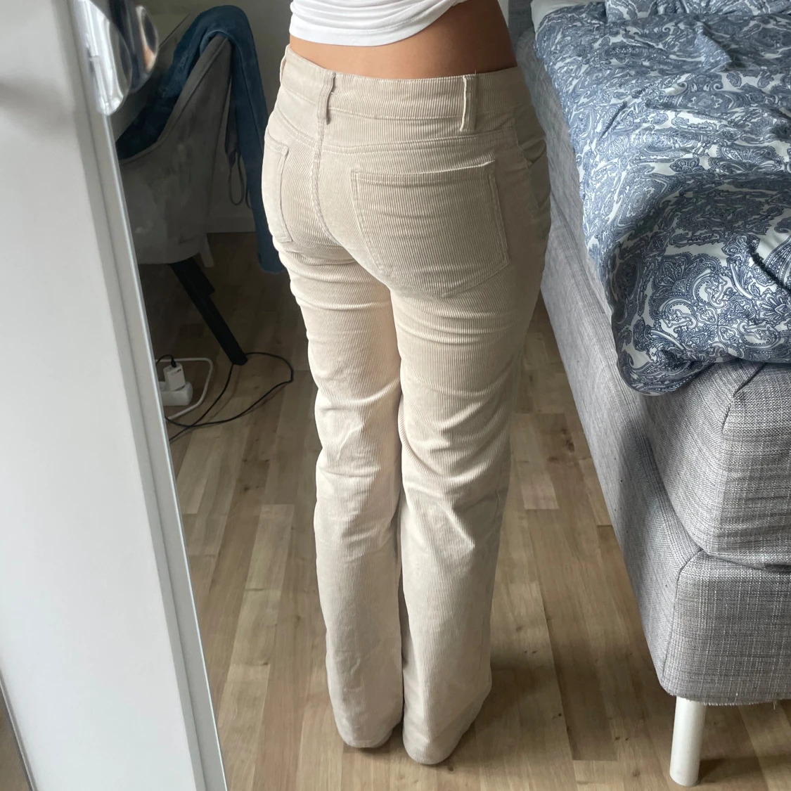 Snygga beiga manchesterbyxor med bootcut och hög midja. Byxorna har klassiska fickor fram och bak samt stängs med dragkedja och knapp. Perfekta för dig som gillar retrostil och vill ha ett par byxor som sticker ut lite extra.