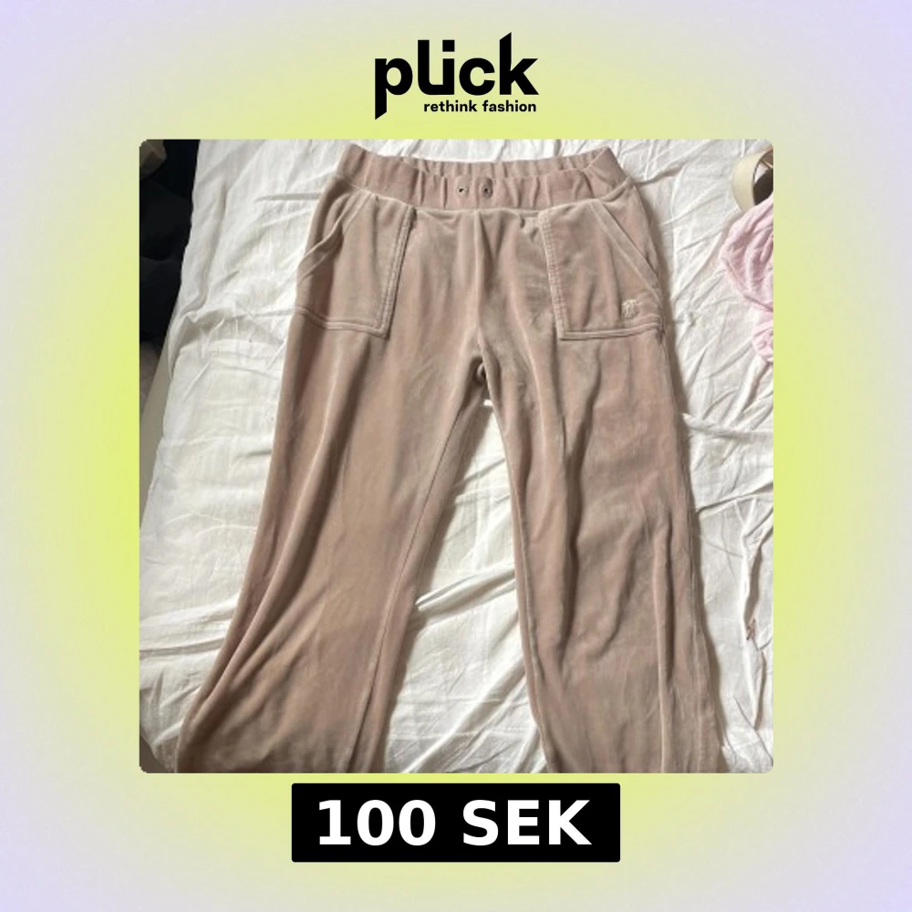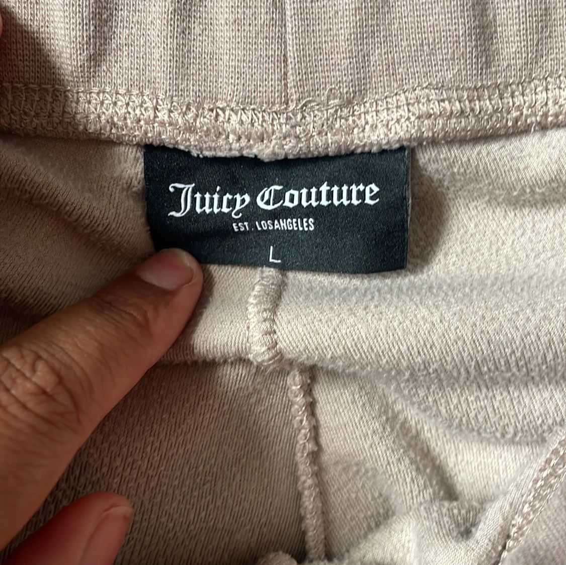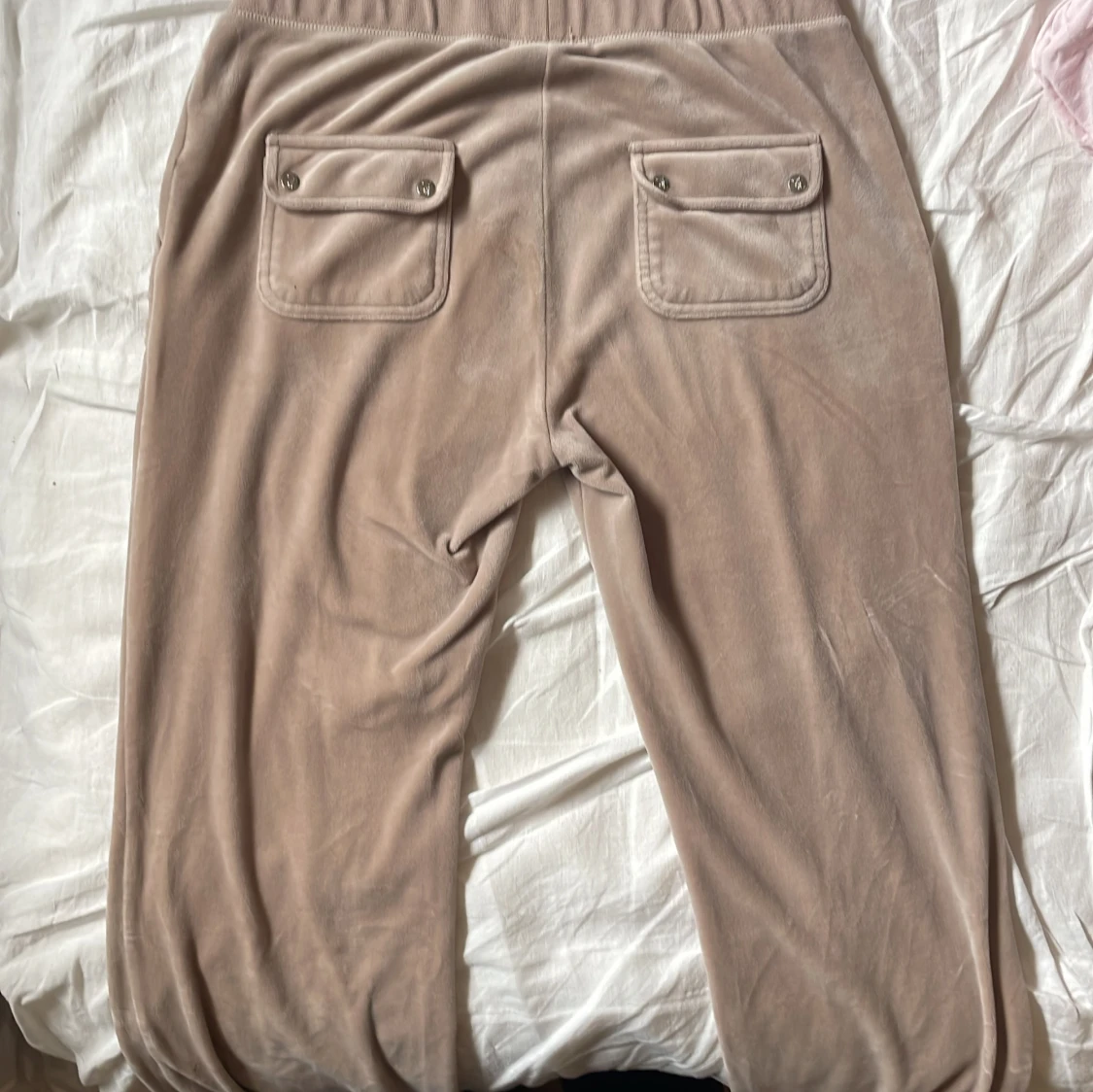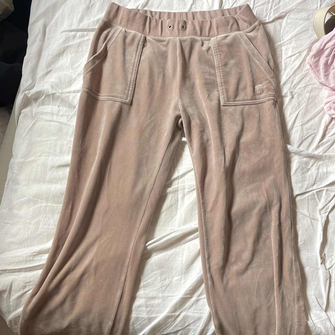 Supermjuka beiga mjukisbyxor från Juicy Couture i storlek L. Byxorna har bred resår i midjan, stora fickor fram och bak med snygga silverknappar och diskret logga. Perfekta för chill dagar och har en klassisk Juicy-look i glansig velour.