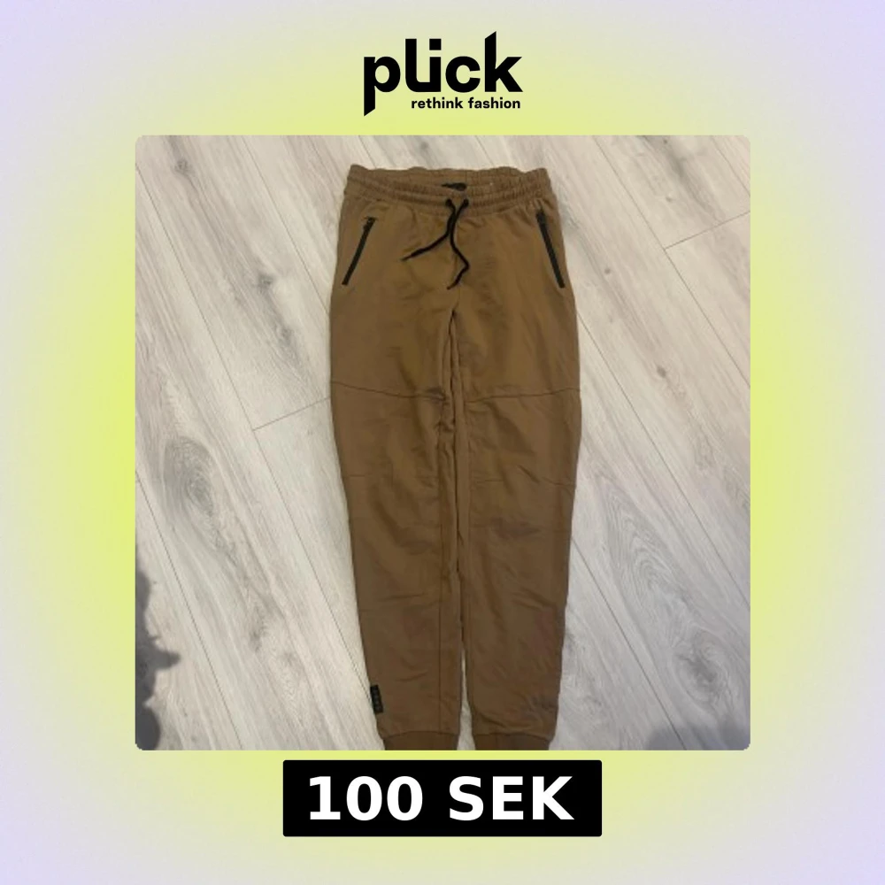 Säljer ett par beiga mjukisbyxor från D.M.D med resår och snörning i midjan. Byxorna har svarta dragkedjor på fickorna och muddar vid bensluten. Perfekta för en avslappnad stil.