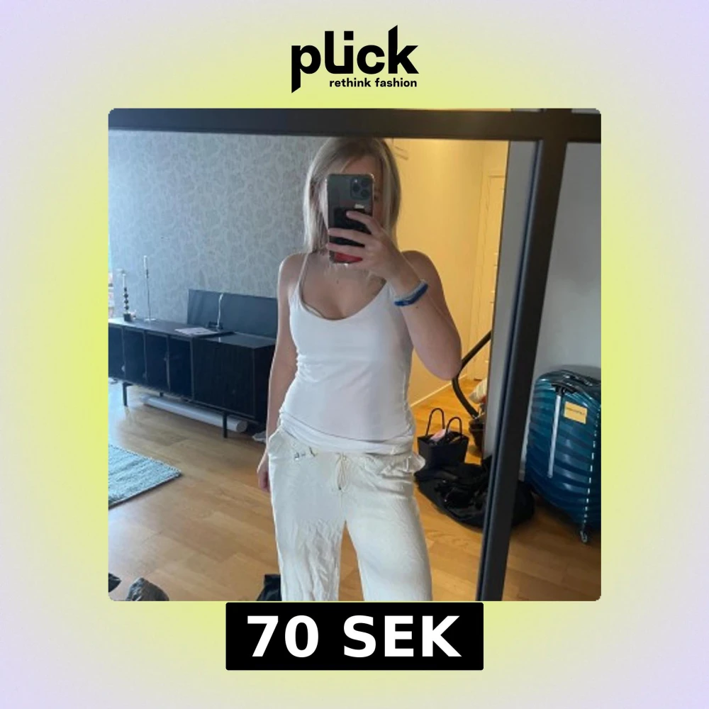Säljer ett par beiga linnebyxor. Byxorna har en avslappnad passform och är perfekta för chill dagar. Tillverkade i mjukt material som känns skönt mot huden. Enkla att matcha med en basic topp eller hoodie.