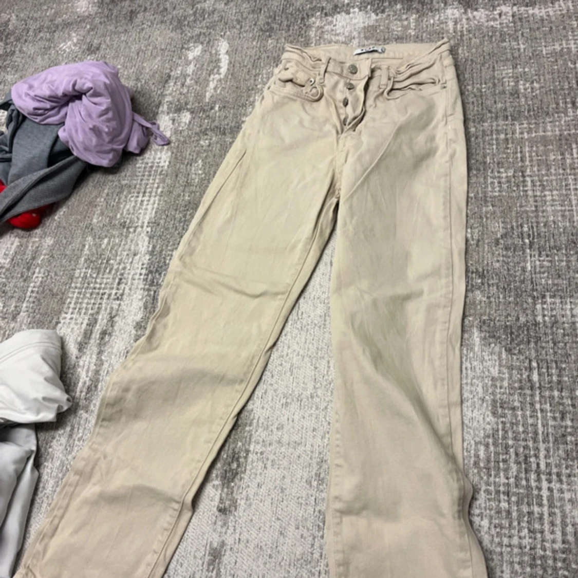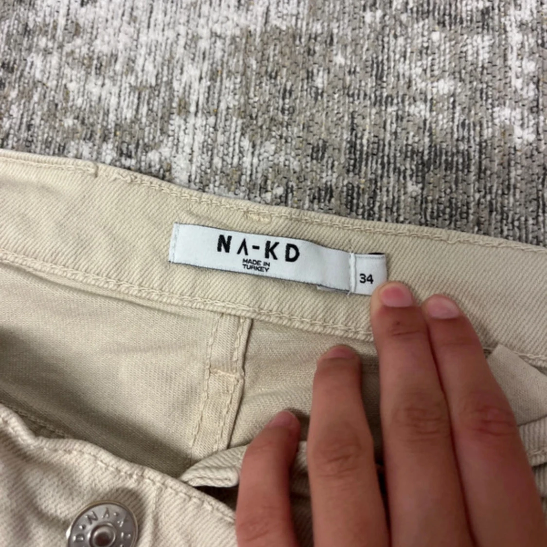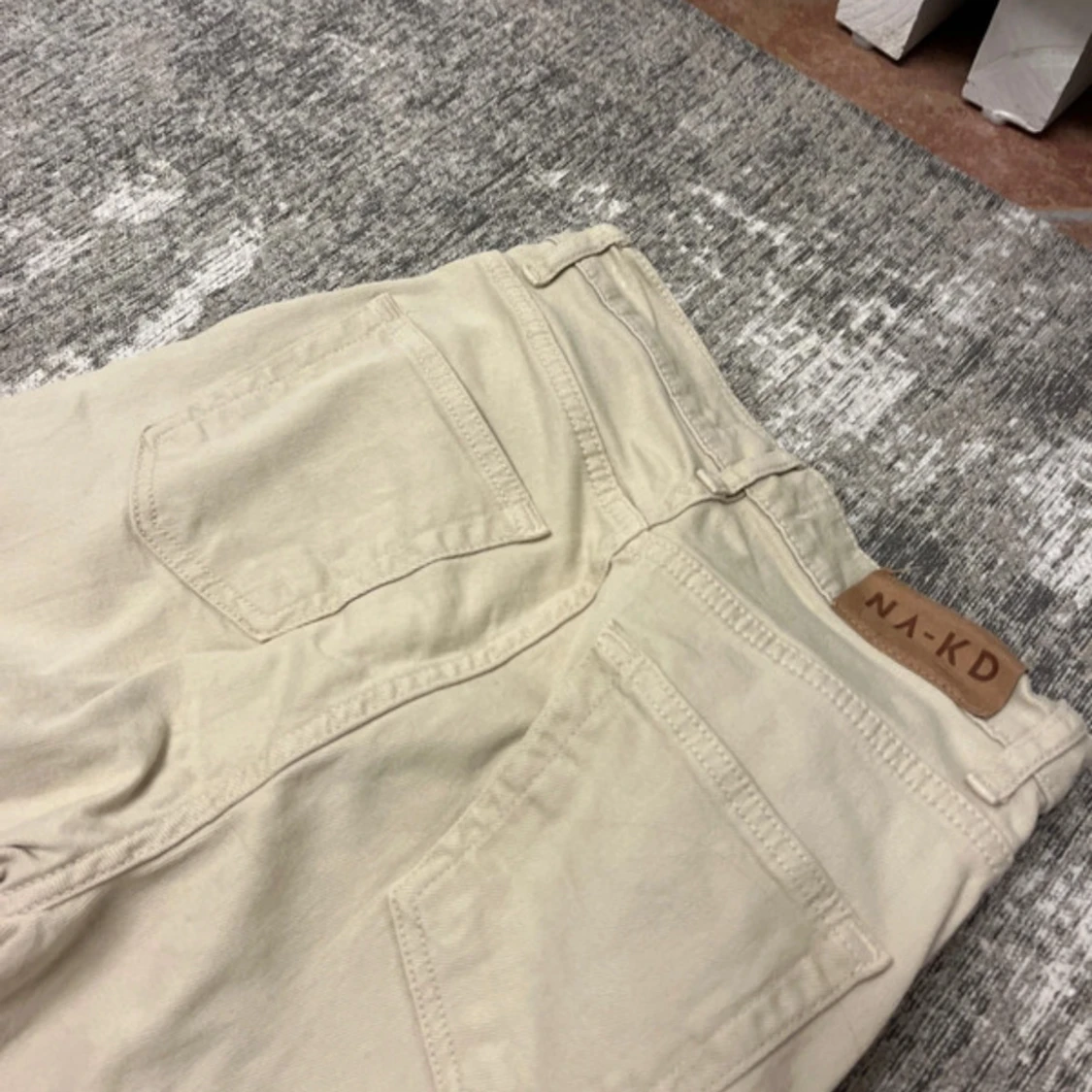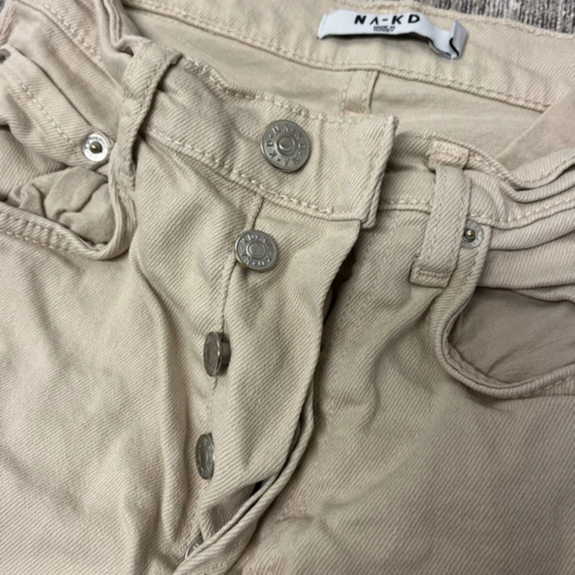 Snygga beiga jeans från NA-KD i rak modell med hög midja. Byxorna har klassiska fem fickor, knäppning med flera silverfärgade knappar och är tillverkade i bomull. Perfekta till en chill vardagslook.