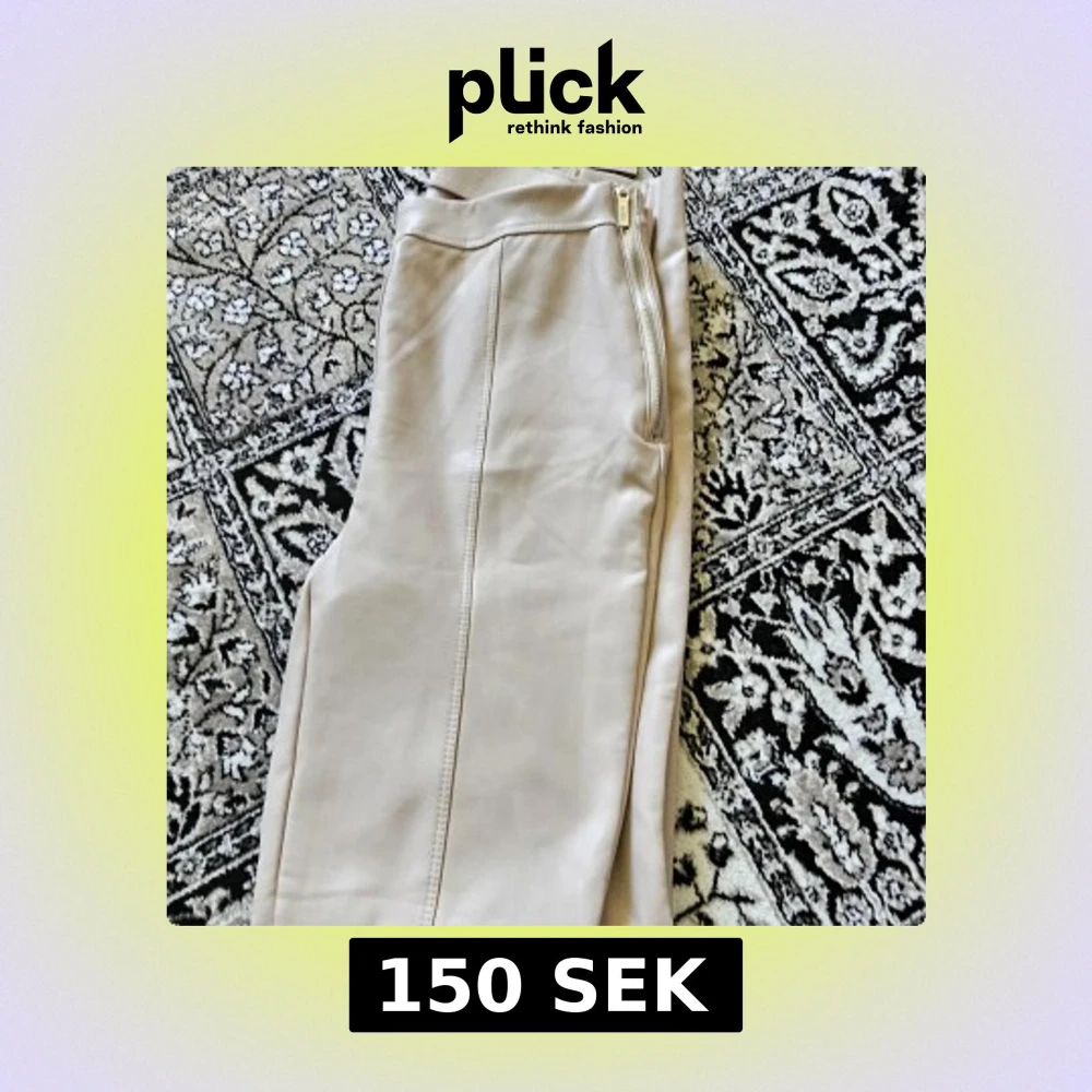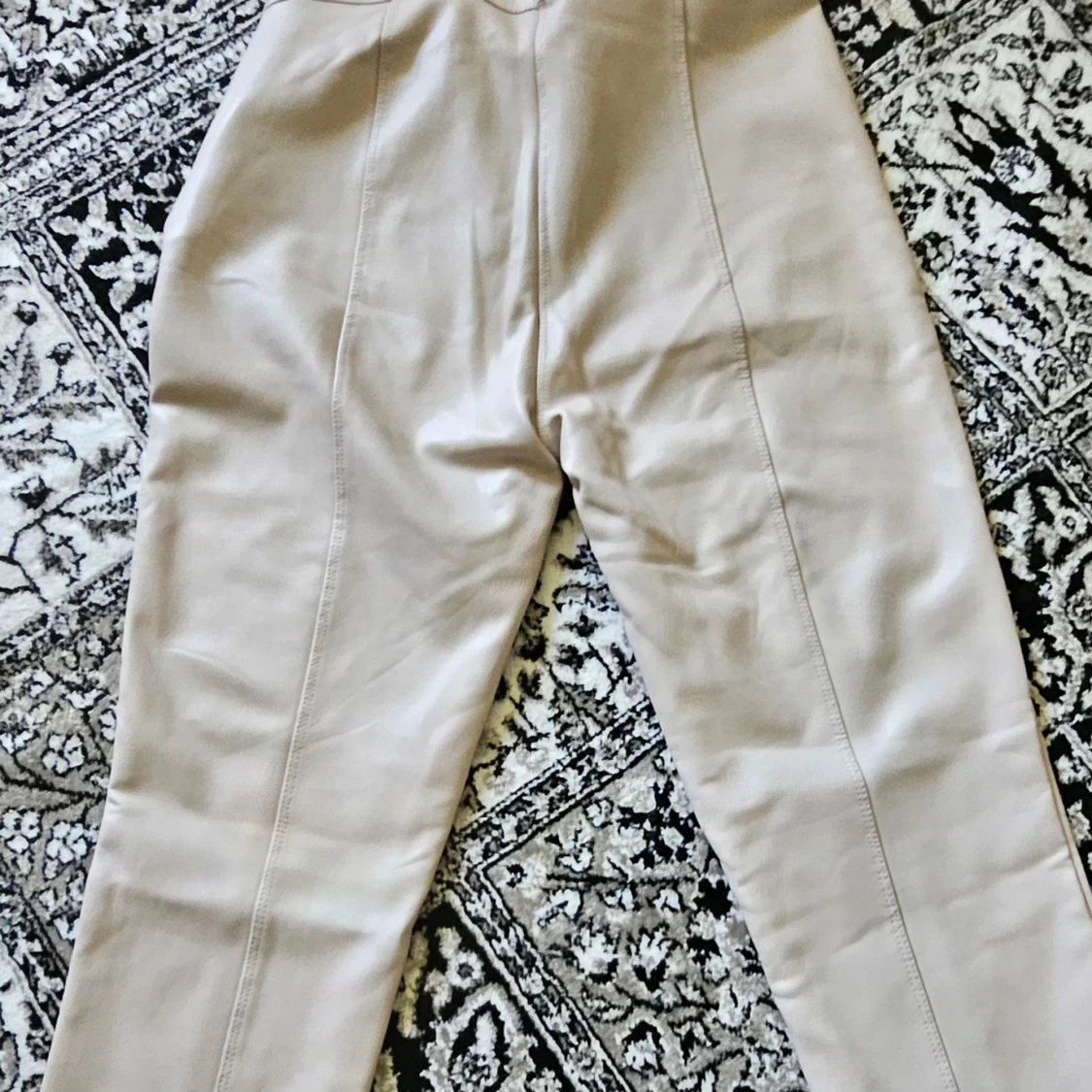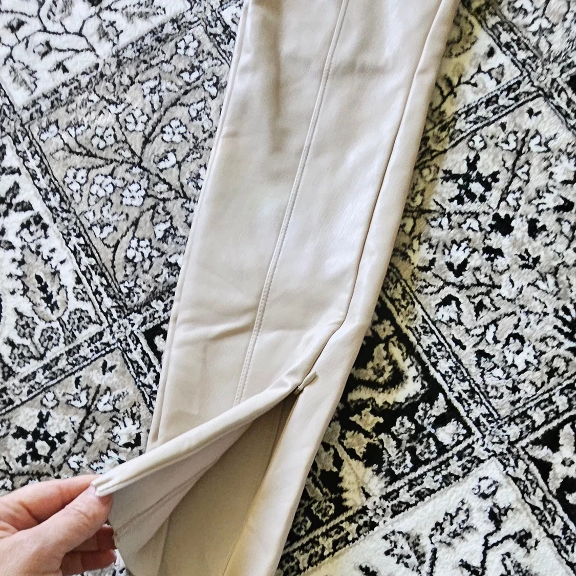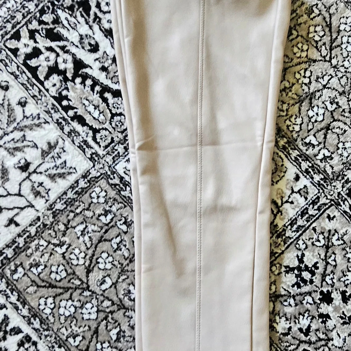 Snygga beiga leggings i skinnimitation med dragkedja vid midjan och slits nertill på benen. Tight passform och stilrena sömmar längs framsidan. Perfekta för en trendig och edgy look. Helt nya aldrig använda ,stl S