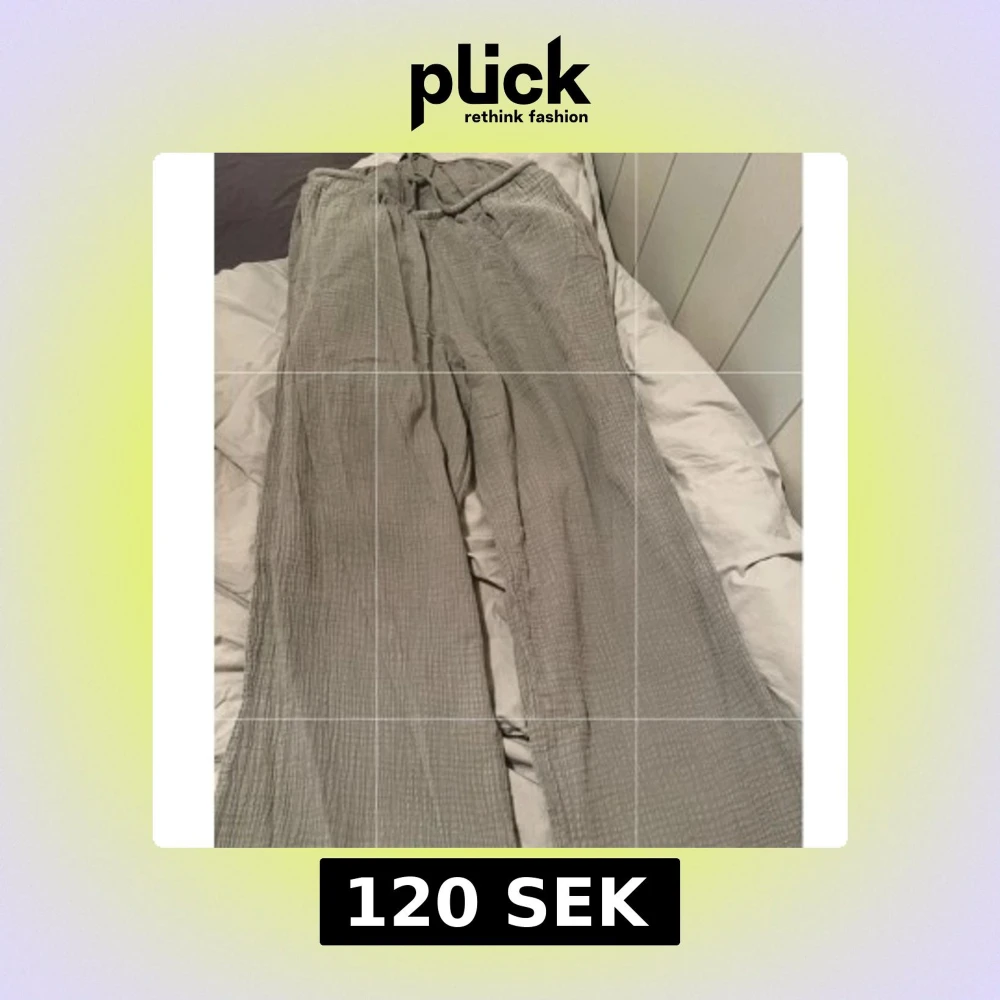 Säljer ett par gråa linnebyxor med vida ben och snörning i midjan. Byxorna har en avslappnad passform och är tillverkade i ett luftigt linnematerial med lätt struktur. Perfekta för varmare dagar och chill outfits.