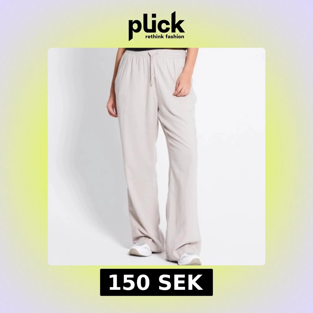 Snygga och avslappnade beiga linnebyxor med bred passform och resår i midjan samt snörning. Byxorna har raka, vida ben och är perfekta för en chill och stilren look. Lätta och luftiga i materialet. Byxorna har en ficka där bak på ena sidan (porto tillkommer).