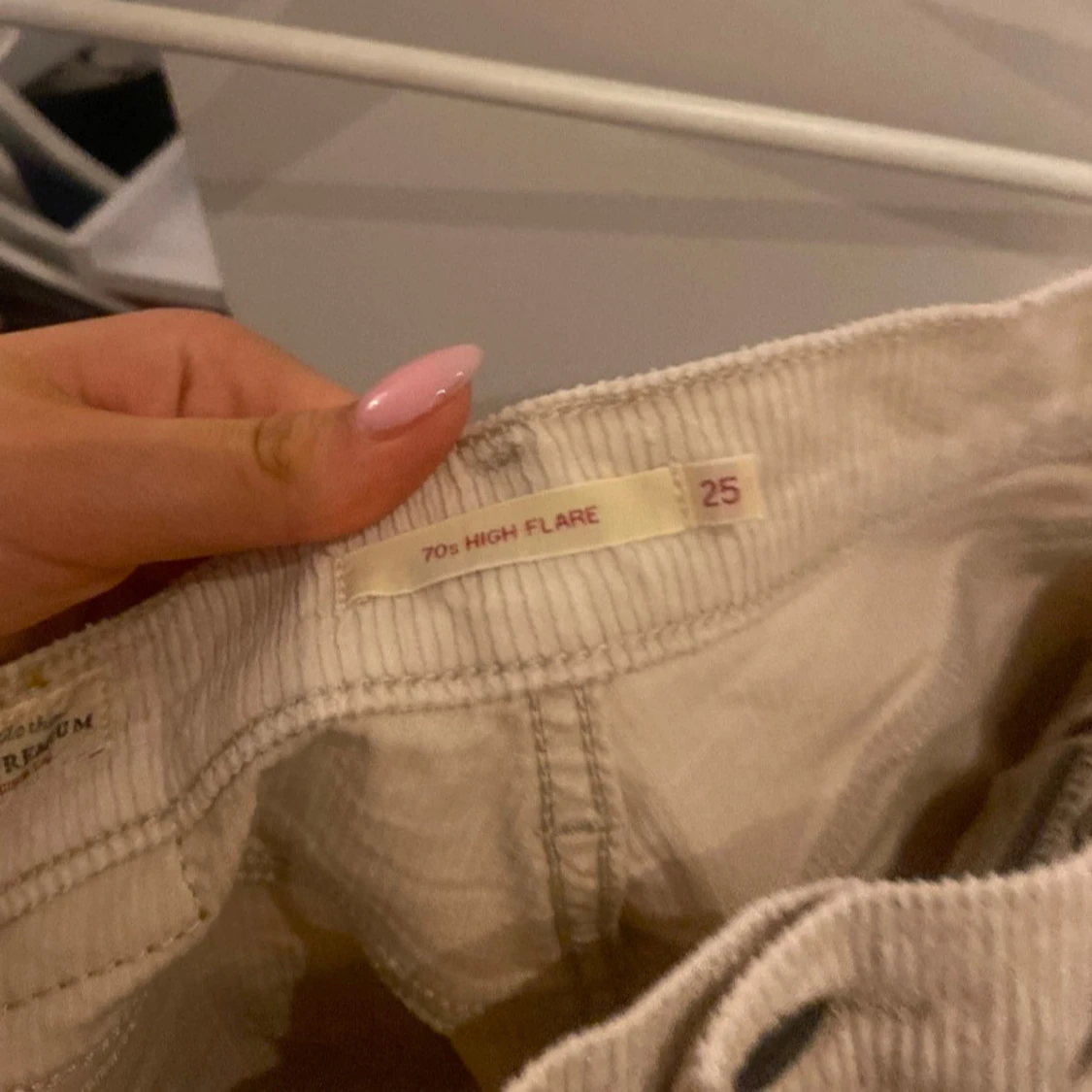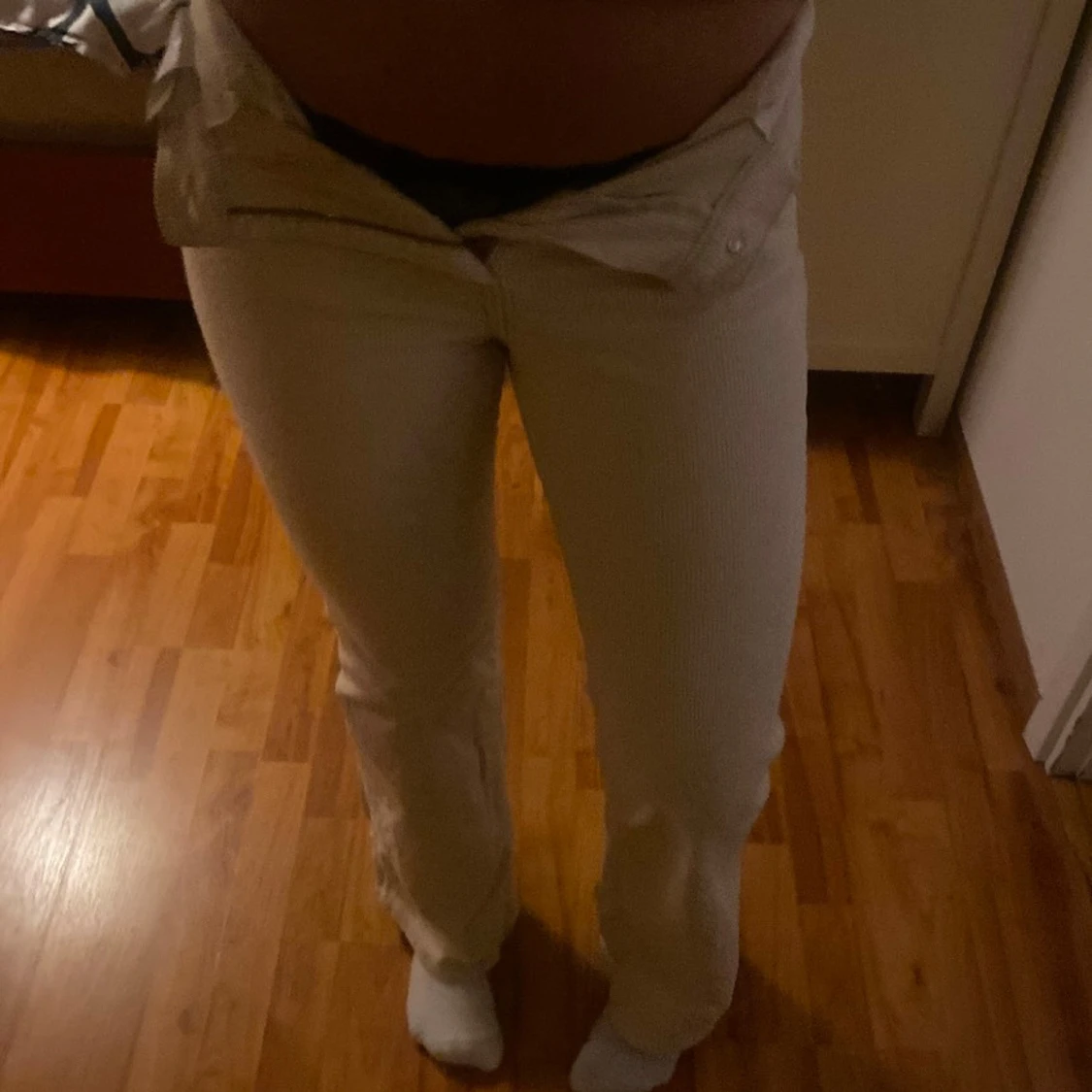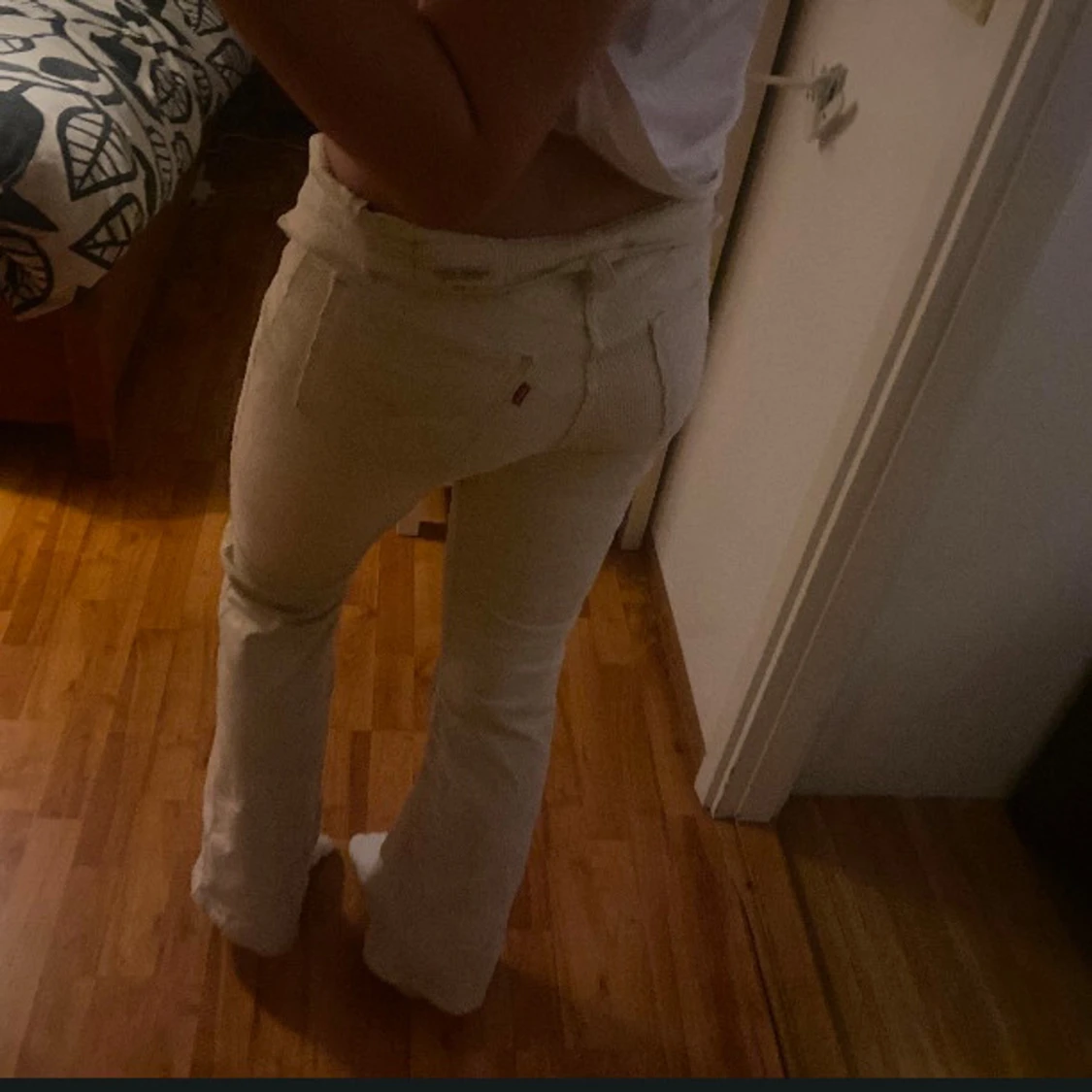 Snygga beige byxor med hög midja och utsvängda ben i 70-talsstil. Säljer då de tyvärr är för små för mig. ! DE ÄR HÖGMIDJADE MEN VIKT NER DOM! Jag är 177 för referens så de är ganska långa🫶 köpt på nk för 1300kr.