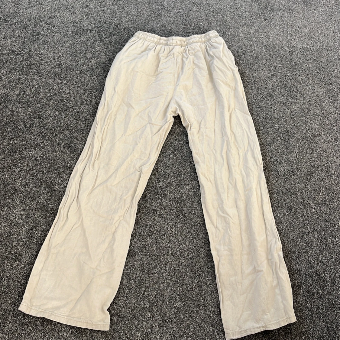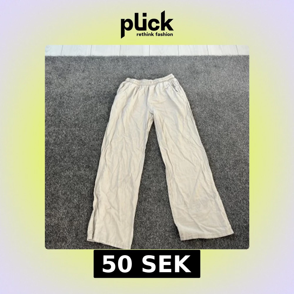 Säljer ett par bekväma beige linnebyxor från Lindex. De har en elastisk midja och är tillverkade i ett lätt material, perfekt för en avslappnad stil. Byxorna har en rak passform och är idealiska för vardagsbruk.