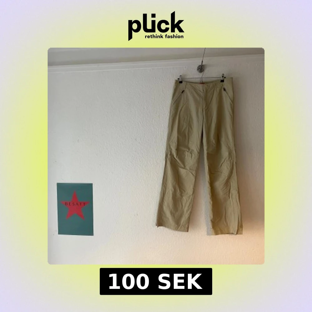 Snygga beige byxor med dragkedja vid fickorna. De har en flared/baggy passform och är perfekta för en avslappnad stil. Byxorna är tillverkade i ett lätt material som ger en bekväm känsla. Y2k