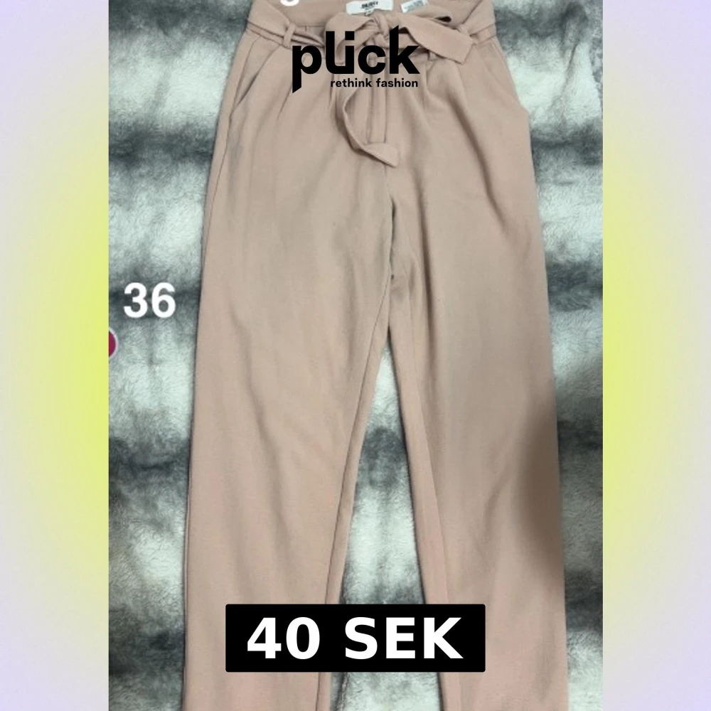 Snygga beige byxor från Object med hög midja och knytband i midjan. Byxorna har raka ben. Perfekta för dig som gillar stilrena plagg.🌸Finns noppor och några svaga fläckar. Storlek 36