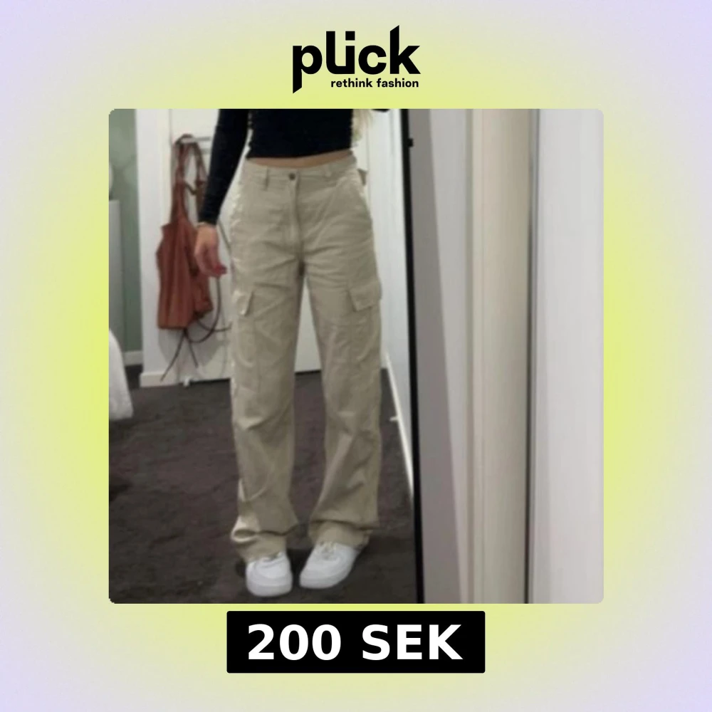 Ett par beige cargobyxor flera stora fickor på sidorna. Byxorna har en avslappnad passform och är tillverkade i bomull.