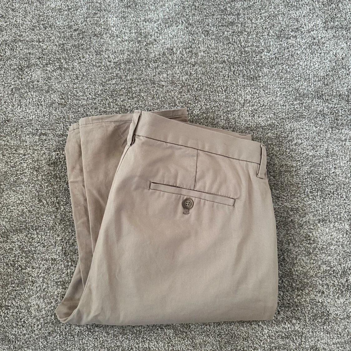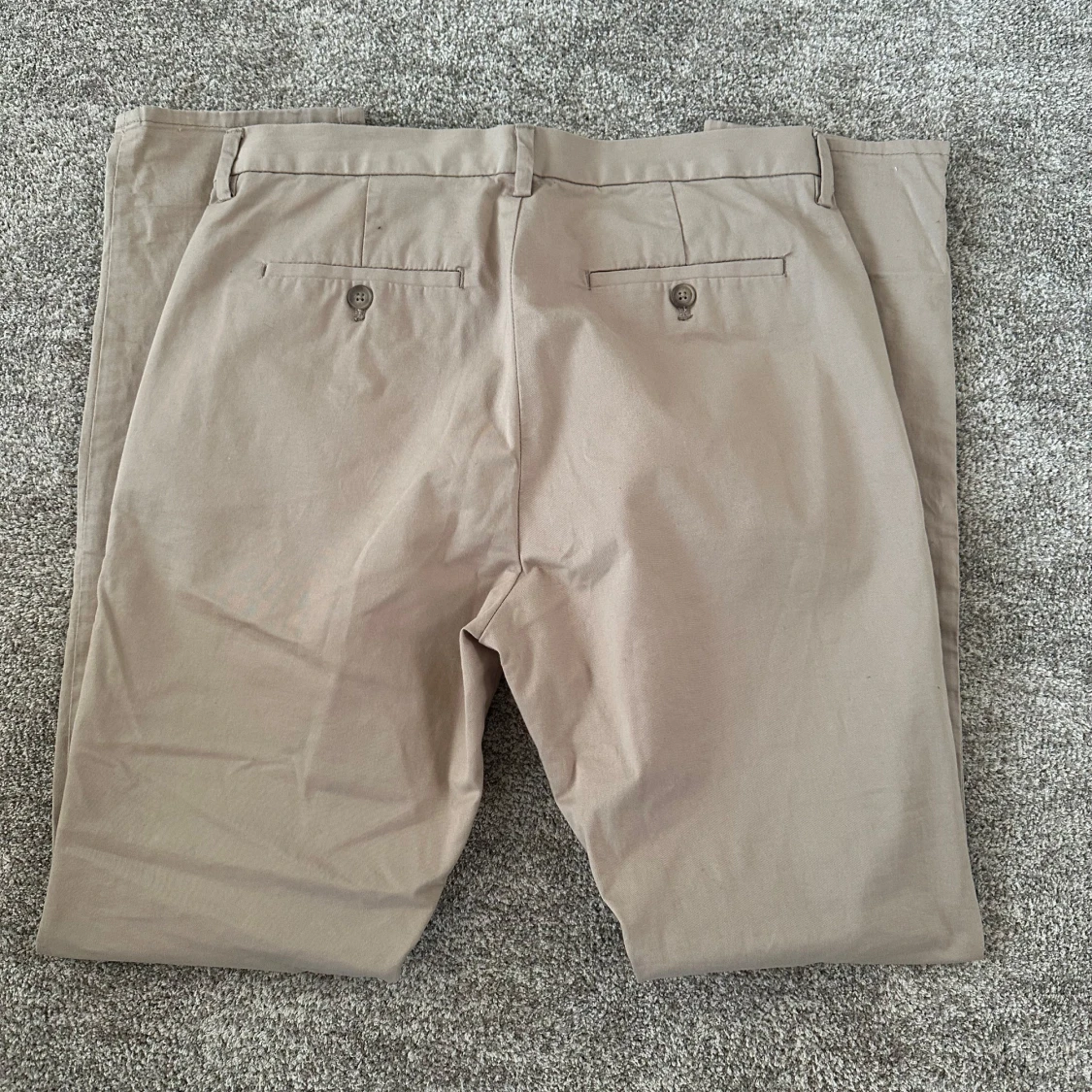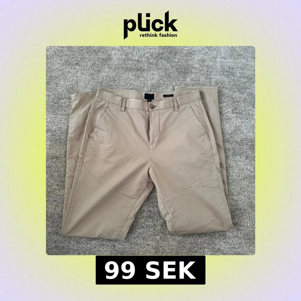 Snygga beige chinos med klassisk slim fit passform och bälteshällor. Byxorna har två sidofickor fram och två bakfickor med knapp. Varumärke HM, storlek 44 vilket motsvarar s. Byxorna är i nyskick och har aldrig använts.