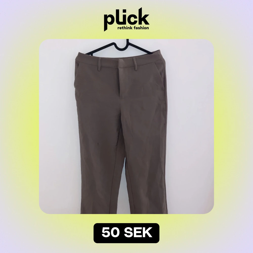 Säljer ett par stiliga beige kostymbyxor i bra skick. De har en klassisk straight passform och är perfekta för både kontoret och mer formella tillfällen. Byxorna har en liten fläck, men det påverkar inte helhetsintrycket. Perfekta för höst och vår!