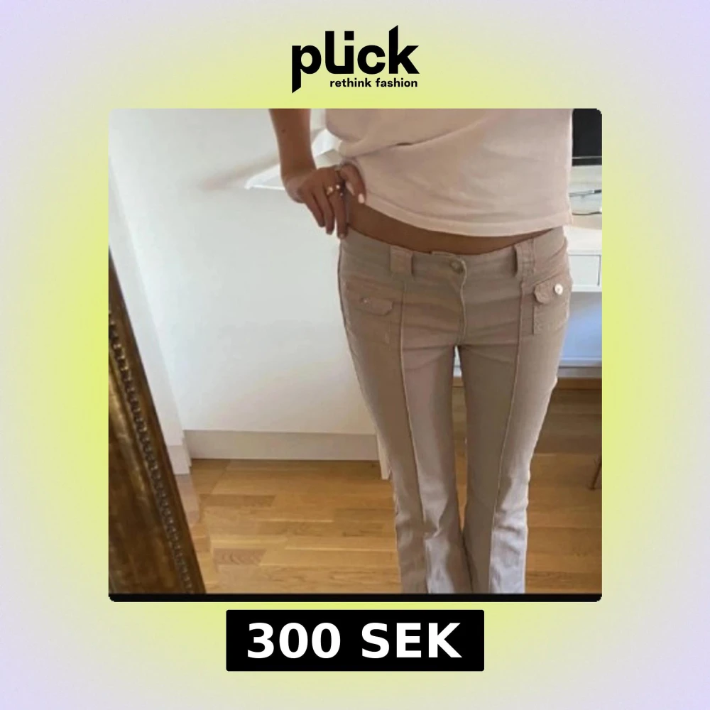Säljer ett par snygga beige byxor med låg midja. Byxorna har markerade sömmar framtill och coola fickor med lock och knappdetaljer. Aldrig använda. Helt helt nya men har tagit bort lappen.