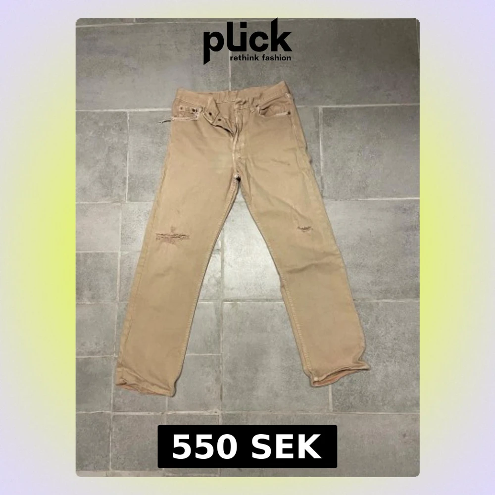 Säljer ett par klassiska Levi's 501 jeans i beige med raka ben och fem fickor. Jeansen har slitna detaljer och är tillverkade i bomull. Passar dig som gillar en tidlös och avslappnad stil. Made in UK.