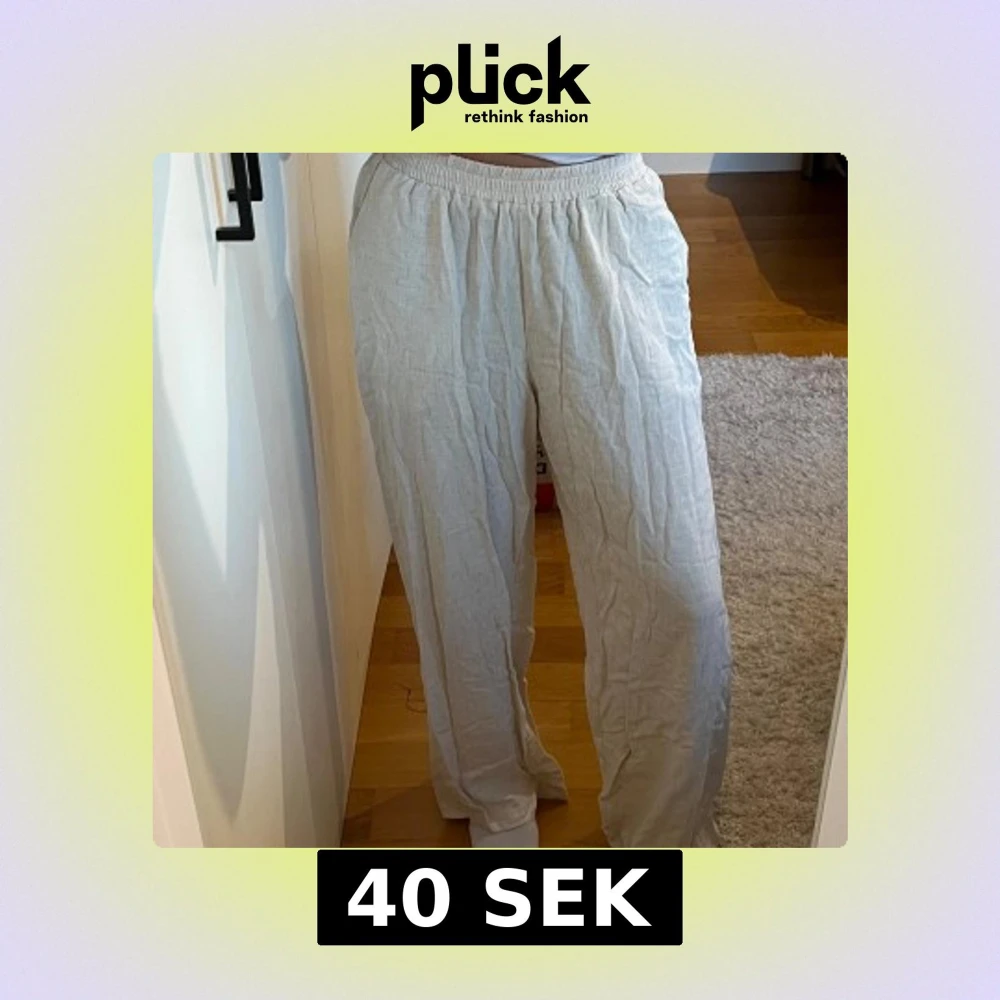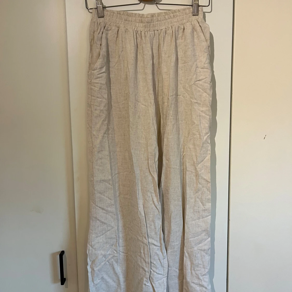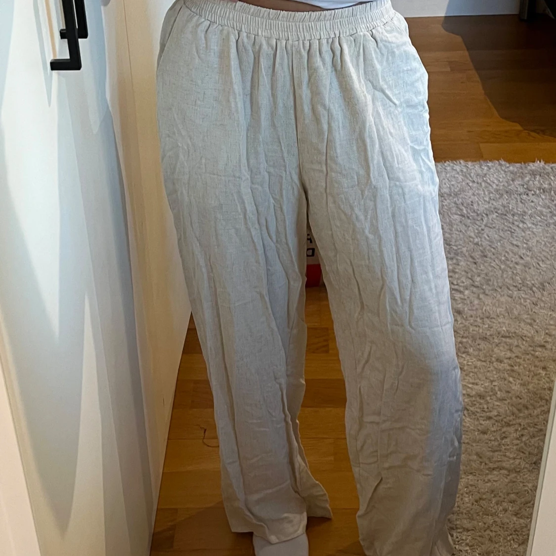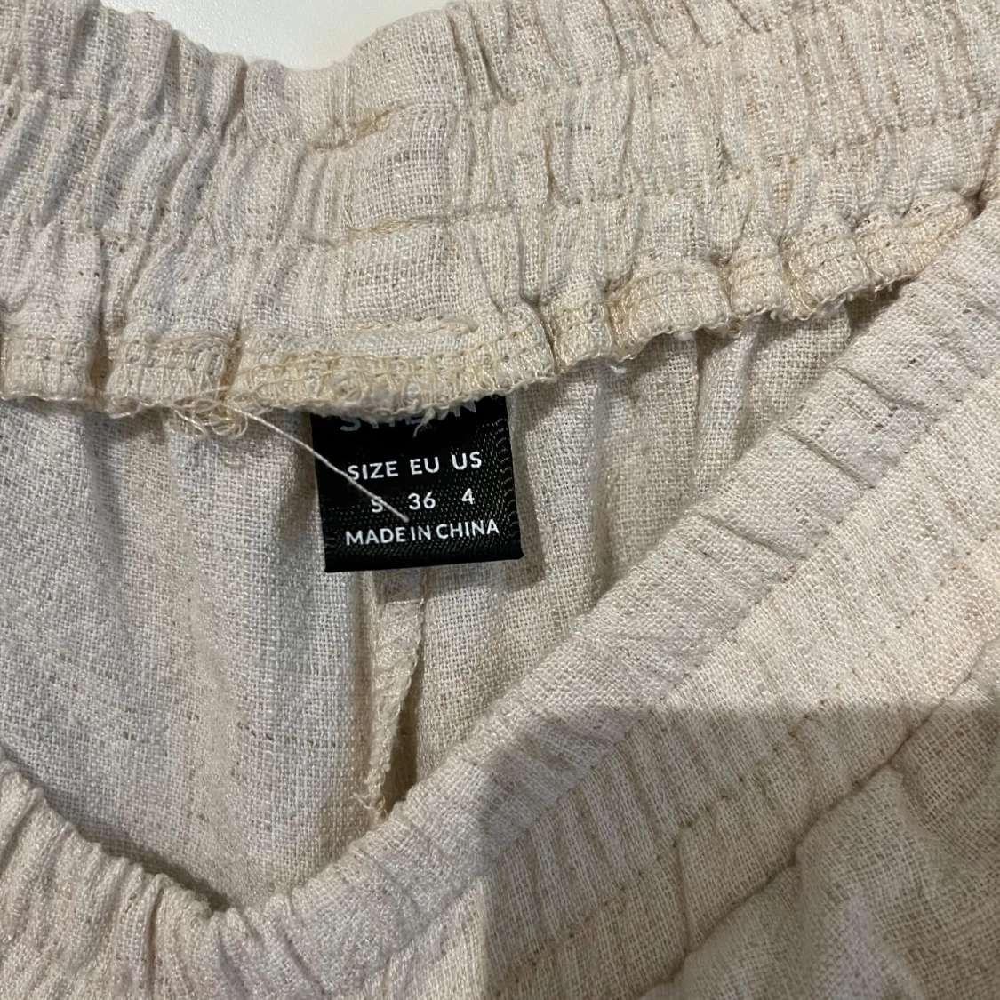 Säljer ett par bekväma beige linnebyxor med elastisk midja från Shein. Byxorna har en avslappnad passform och är perfekta för varma dagar. De är tillverkade i ett lätt och luftigt material som ger en skön känsla.