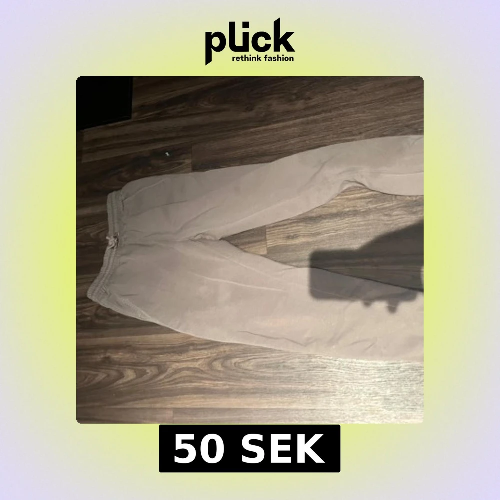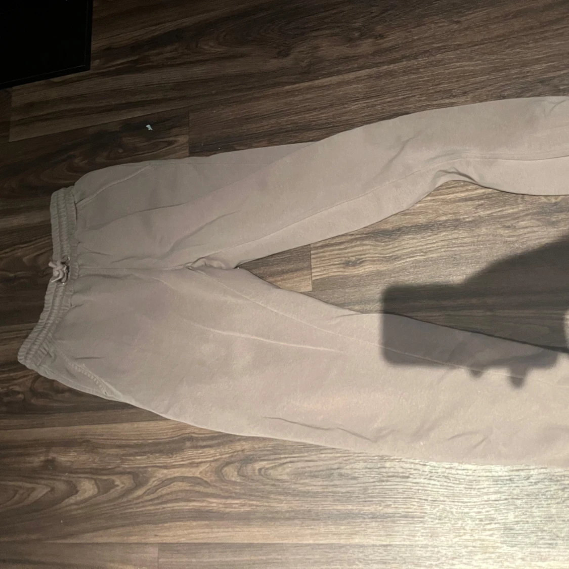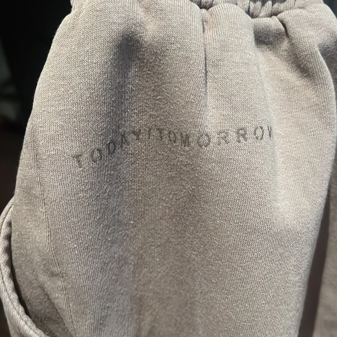 Säljer ett par beige mjukisbyxor från Lindex med trycket 'TODAY/TOMORROW' på benet. Byxorna har elastisk midja med snörning och är gjorda i mjukt bomullsmaterial. Perfekta för chill dagar och häng med kompisar.