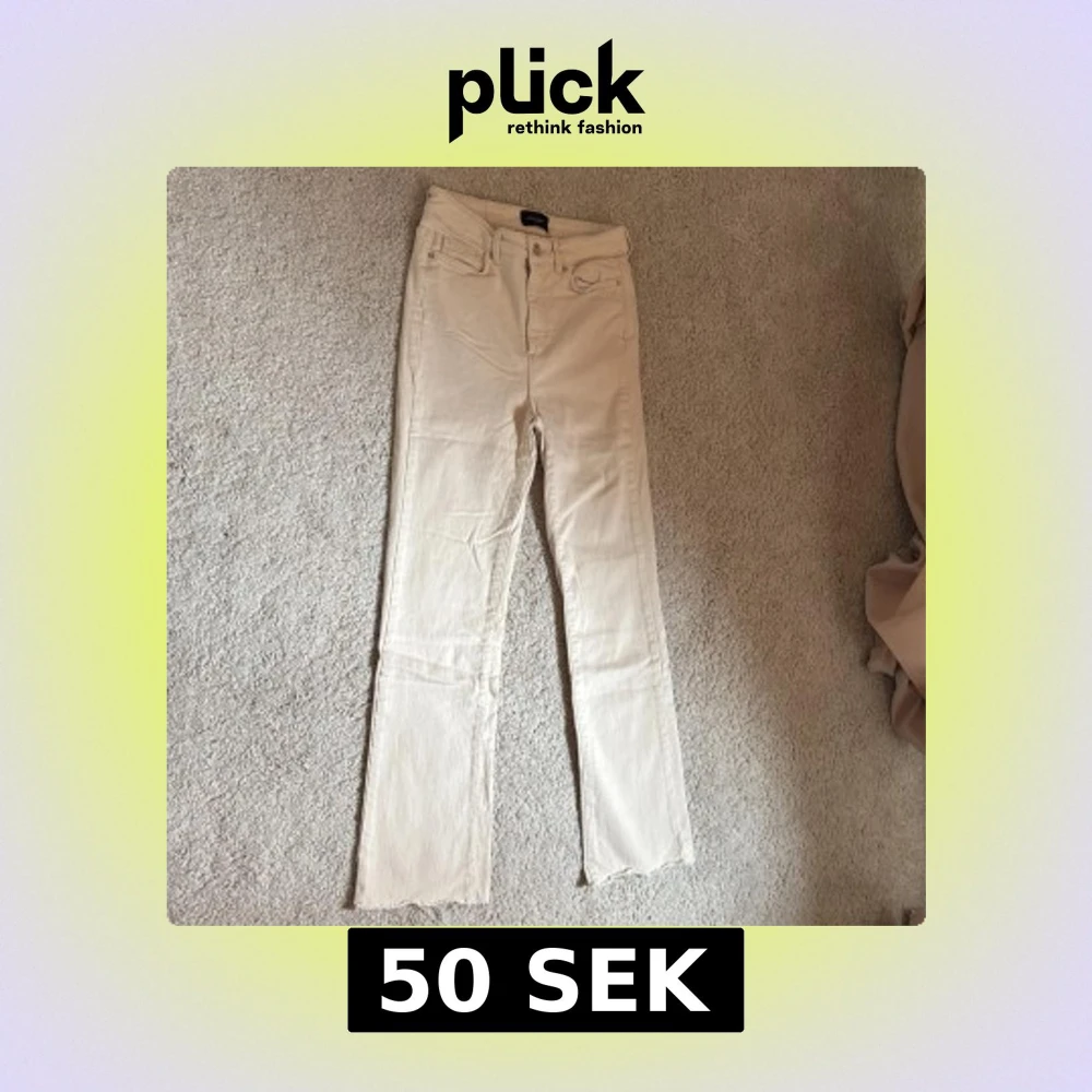 Snygga beige jeans från Vero Moda med raka ben och råa, fransiga benslut. Klassisk femficksmodell med knapp och dragkedja framtill. Perfekta för en avslappnad och trendig look.