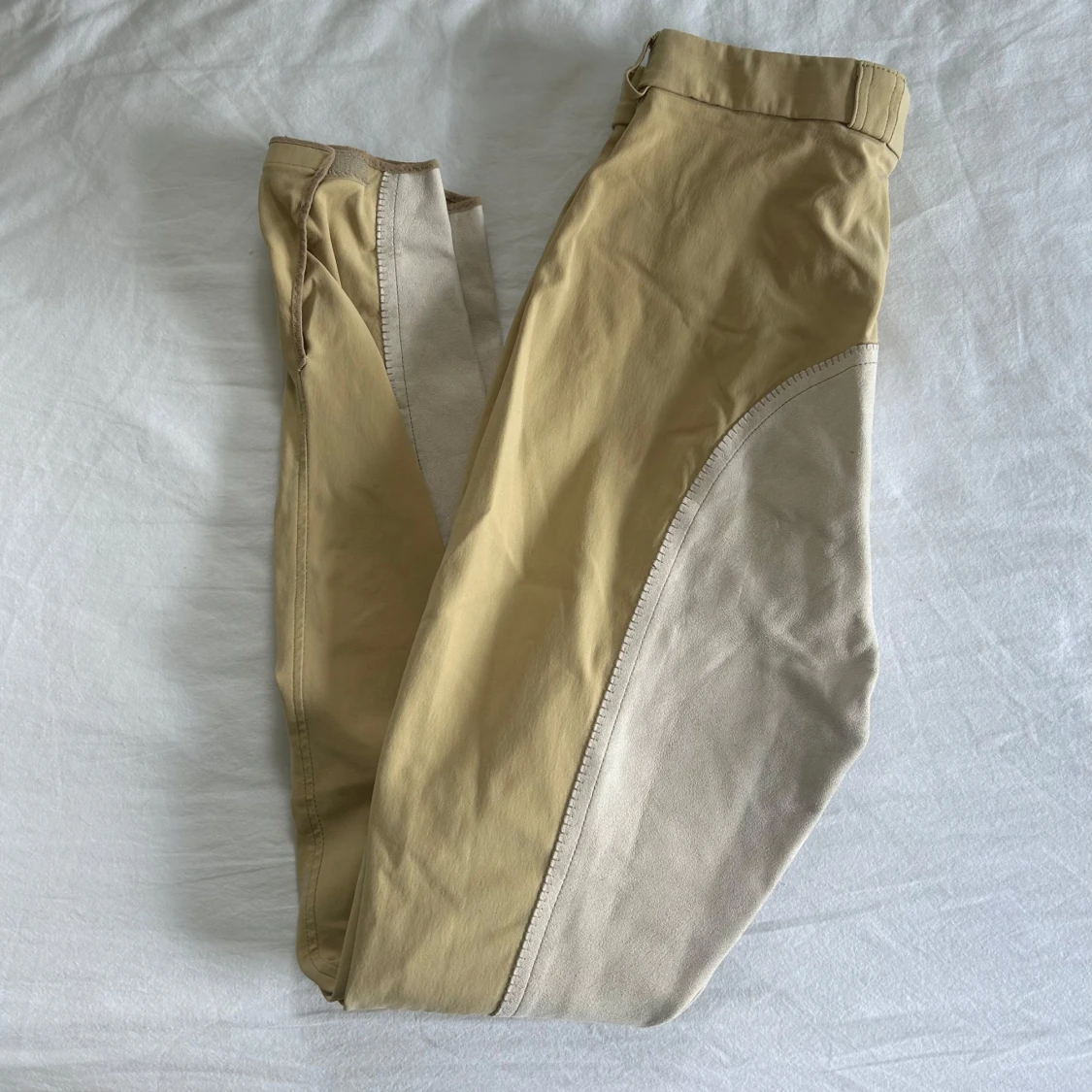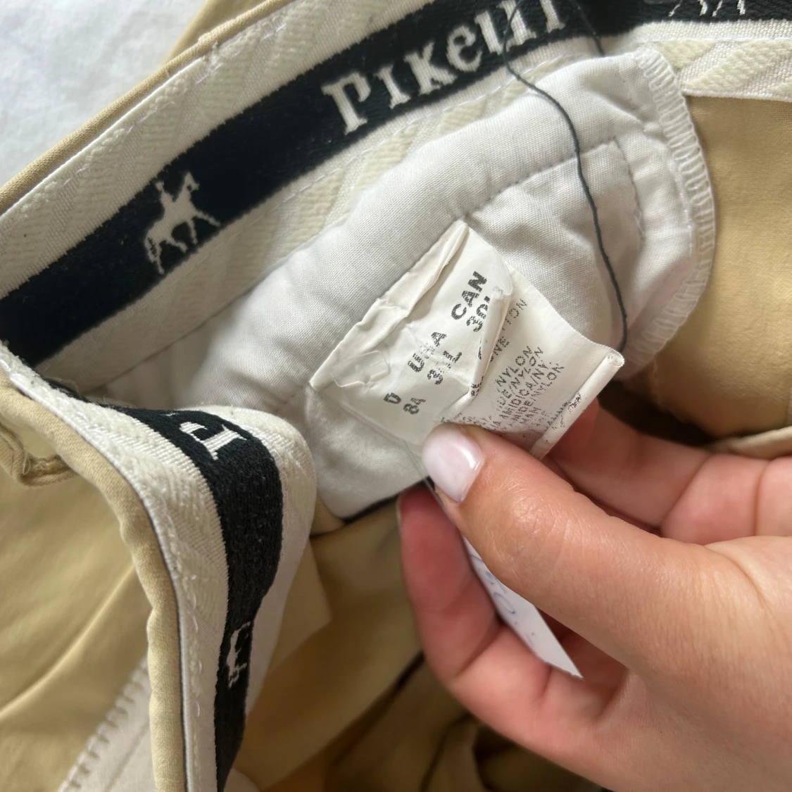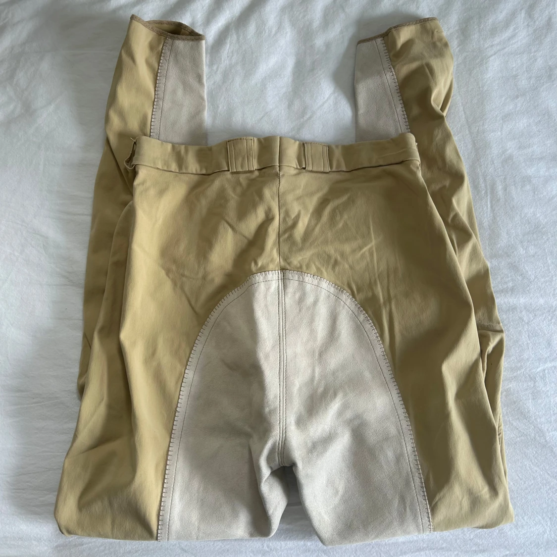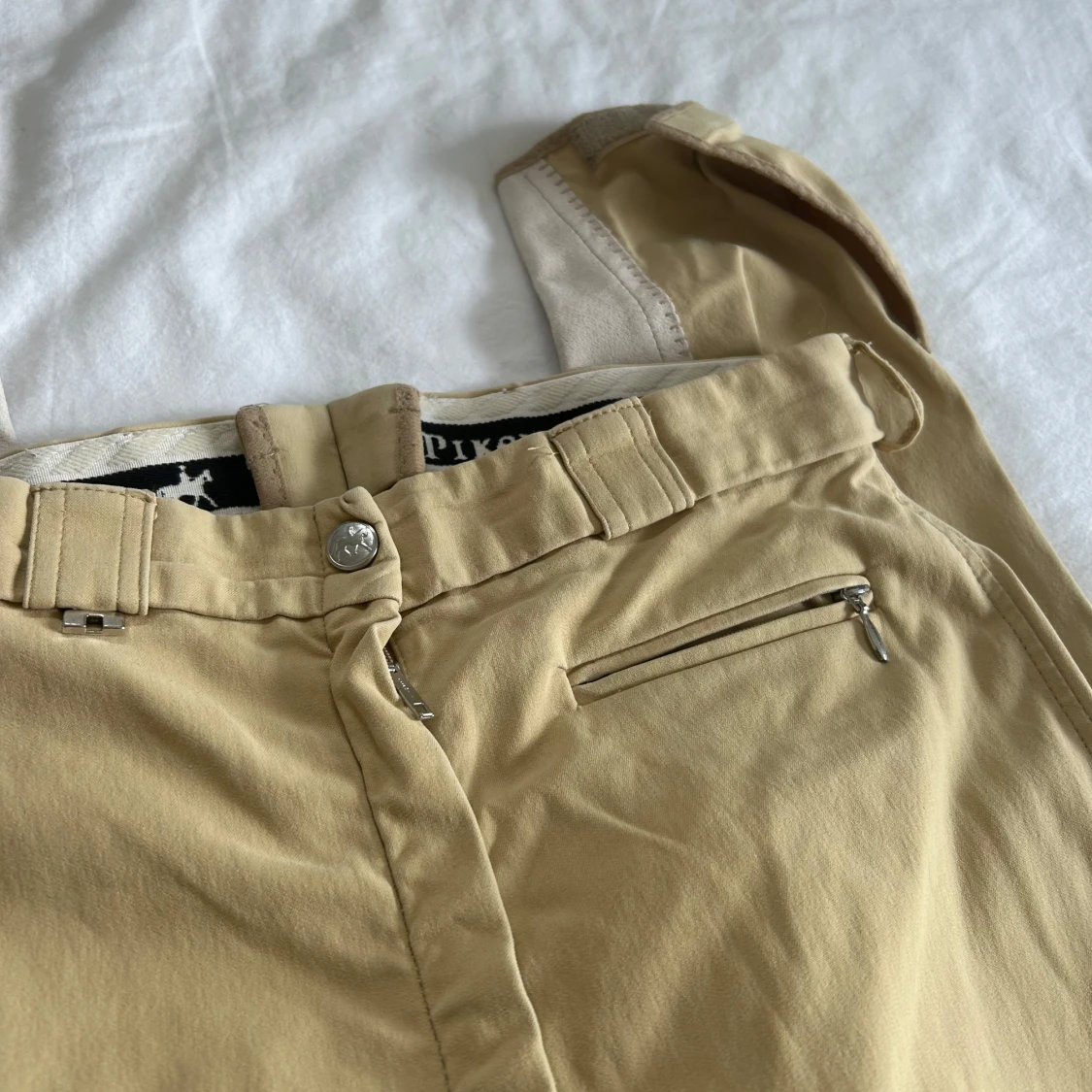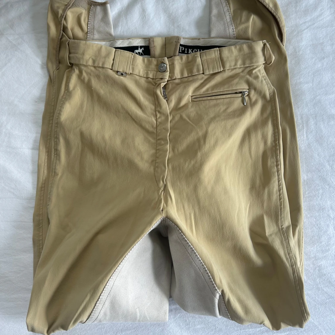 Snygga beige ridbyxor från Pikeur med helskodd design i äkta mocka i ljusare beige. Byxorna har dragkedja fram, bälteshällor och en liten ficka med dragkedja. Perfekta för ridning och har klassisk passform. I strl ungefär S-M