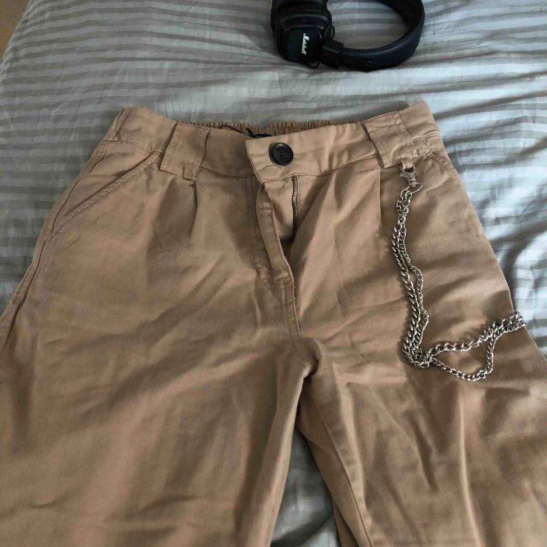 Cargobyxor från Bershka tillsammans med kedja. Väldigt snygga på. Frakt står köpare för: 95 kr (kan hämtas upp i sthlm) Total: 245 kr