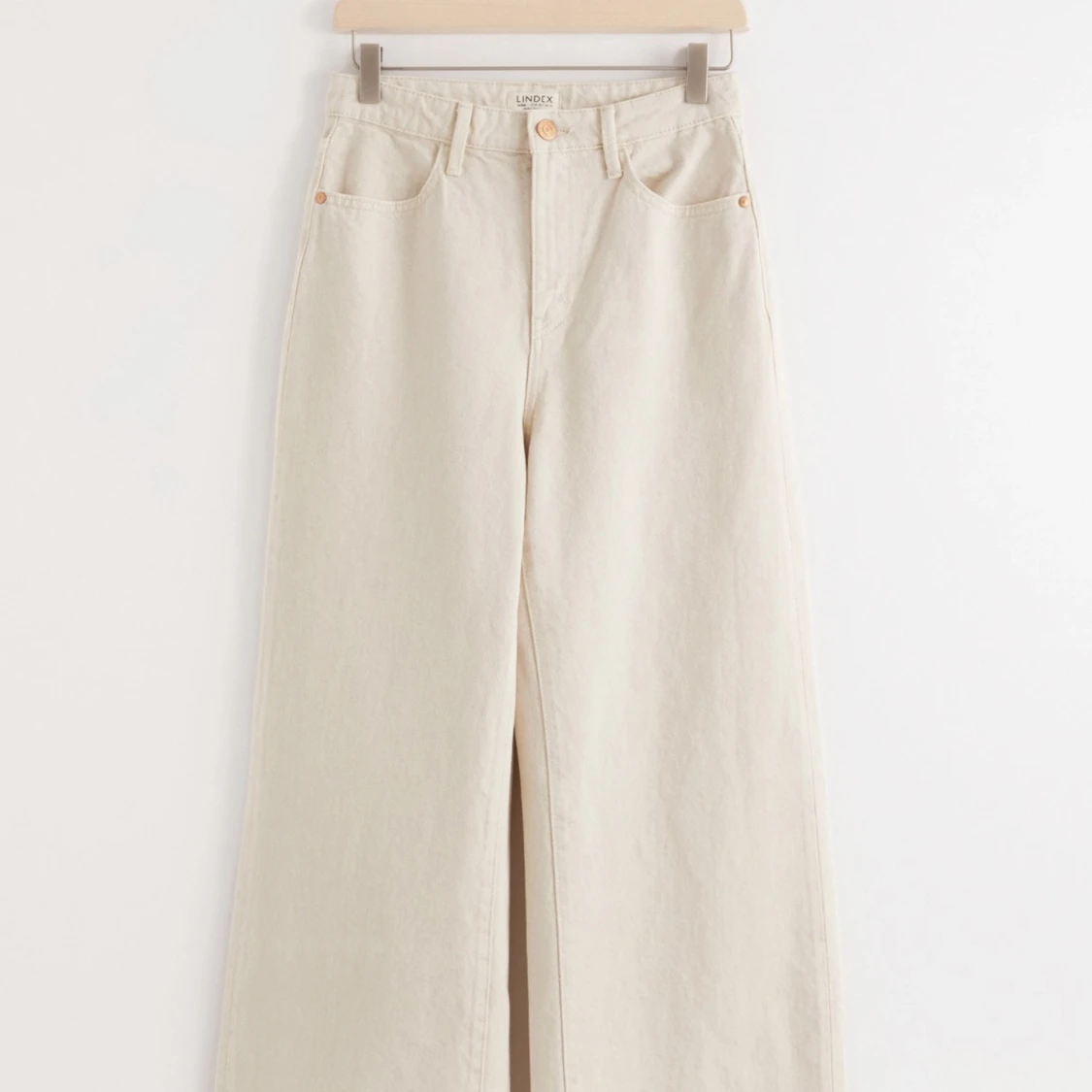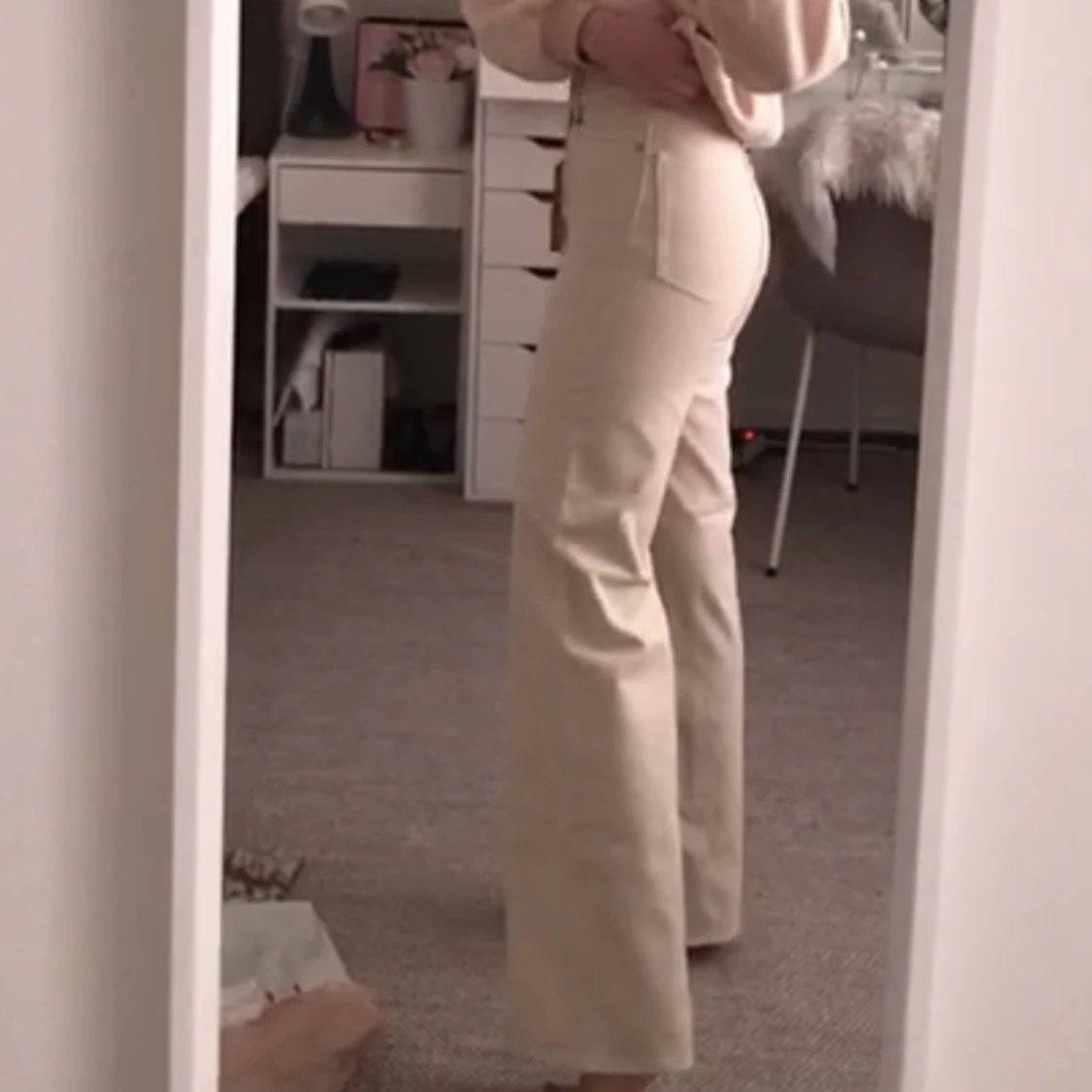 Ett par snygga beiga vida jeans. Endast använda fåtal gånger, slutsålda på hemsidan. Säljes pga för små för mig :( Frakt tillkommer, priset kan diskuteras:)