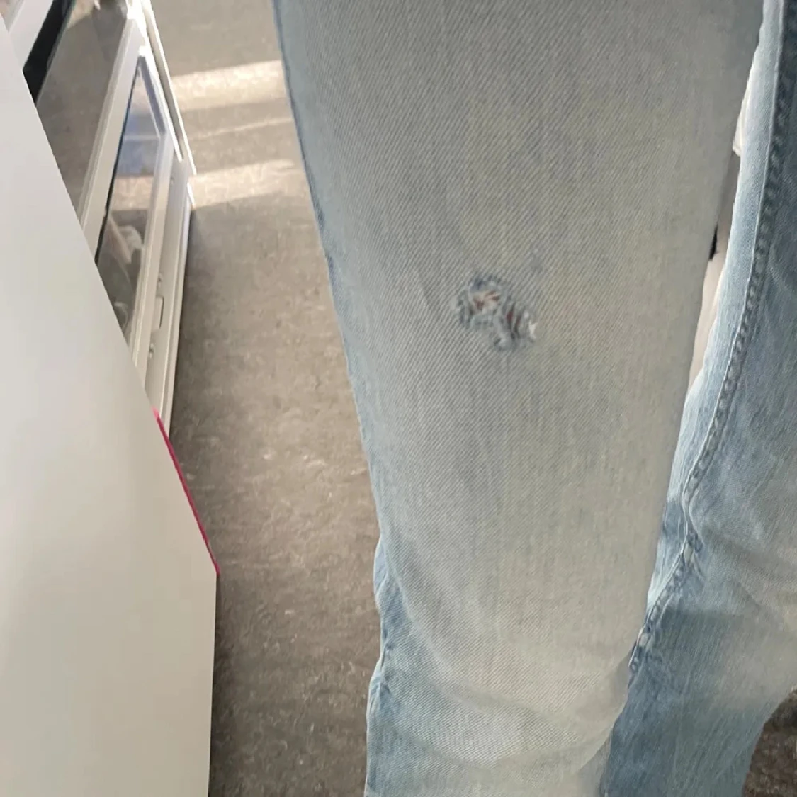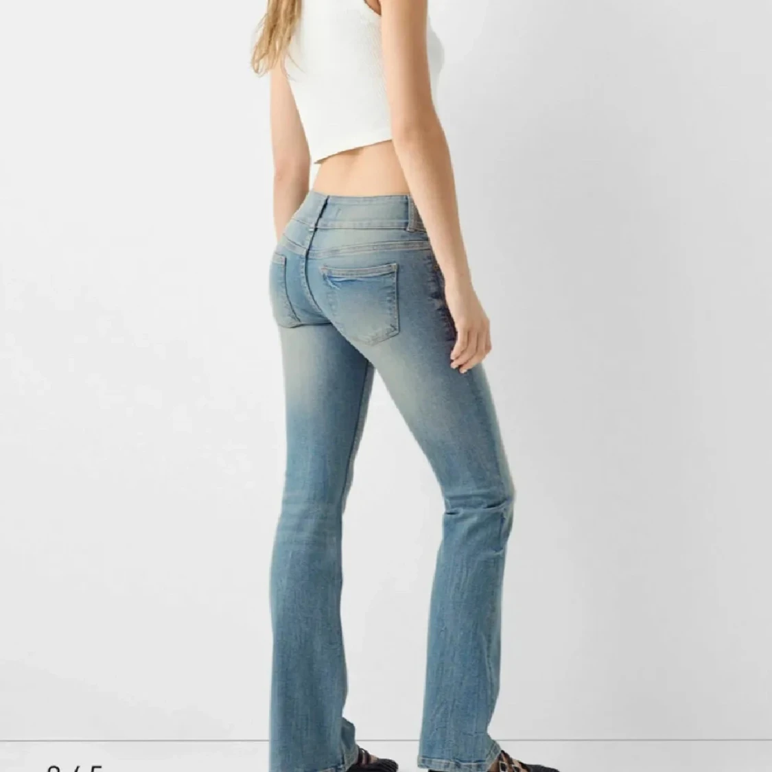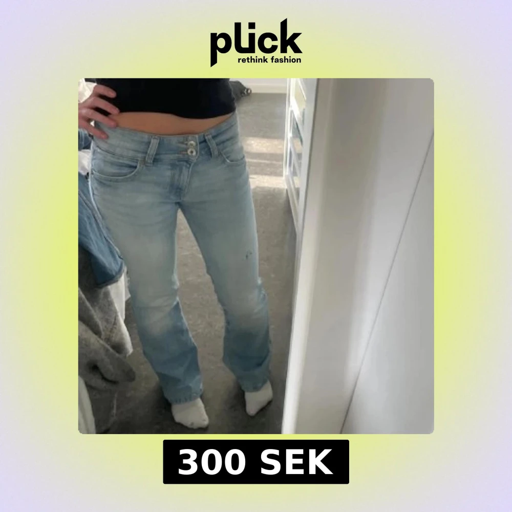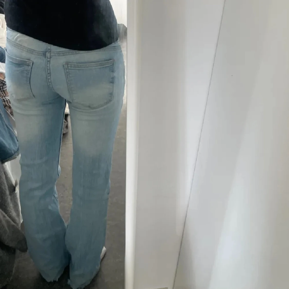Säljer ett par ljusblå jeans med bootcut-modell och låg midja. Storlek 34 och byxan har även ett litet hål vid sidan men tycker det ger en snygg detalj på byxorna