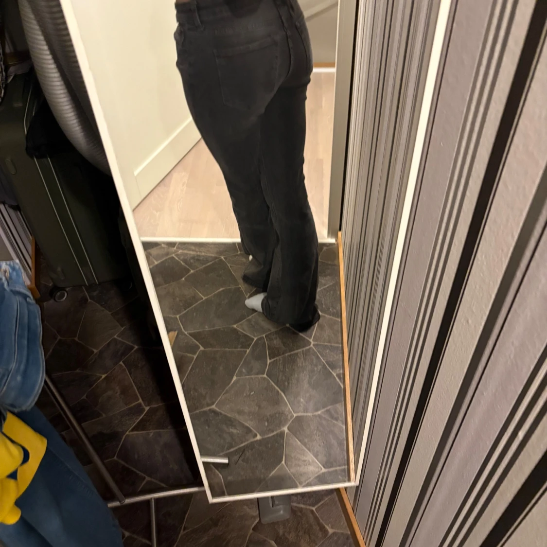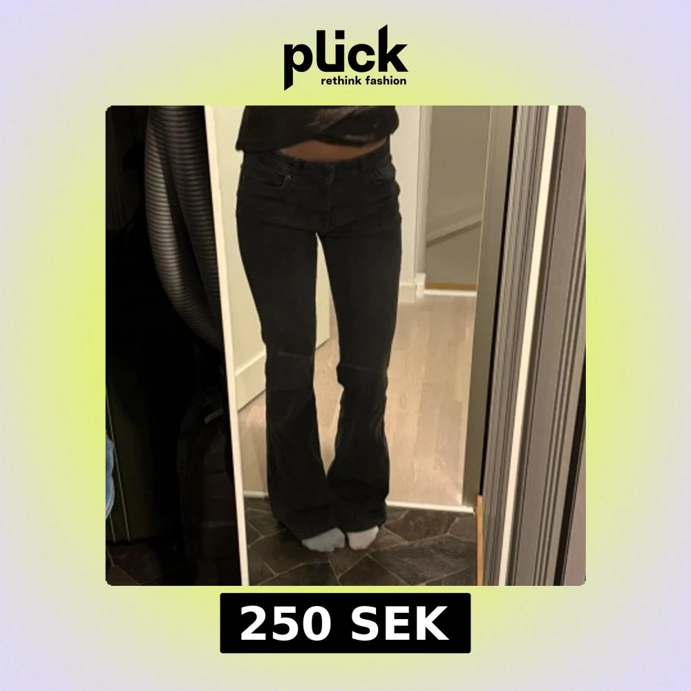 Snygga svarta bootcut jeans med låg midja. Perfekta för en avslappnad stil. De har en klassisk design med fickor och dragkedja. Från bershka i storlek 34.