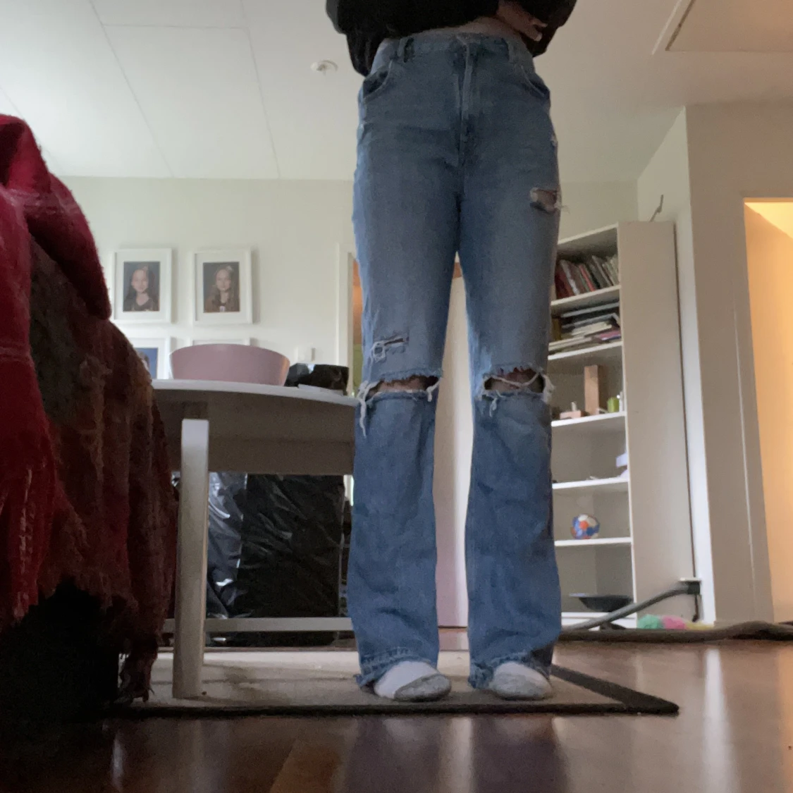 Bershka jeans som är jättesköna men tyvärr ej längre används. Dom är högmidjade och har slitningar på knäna samt baksida fickor. Det är typ en volang/flare grej på botten som är av jeans.