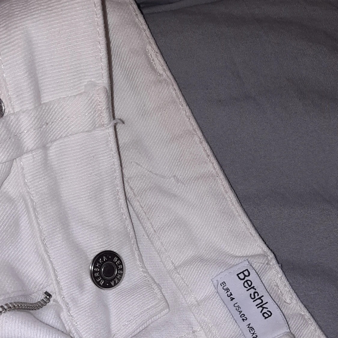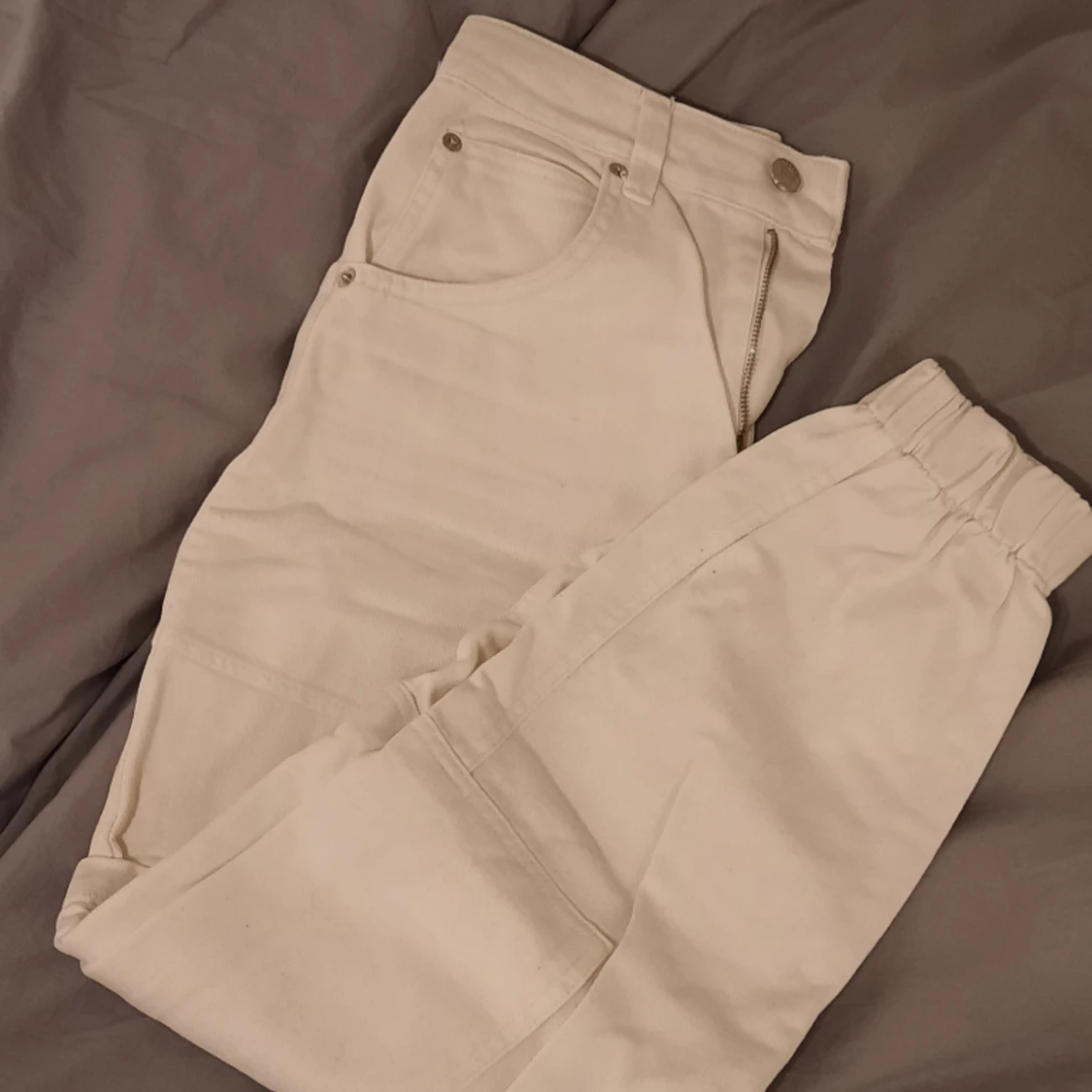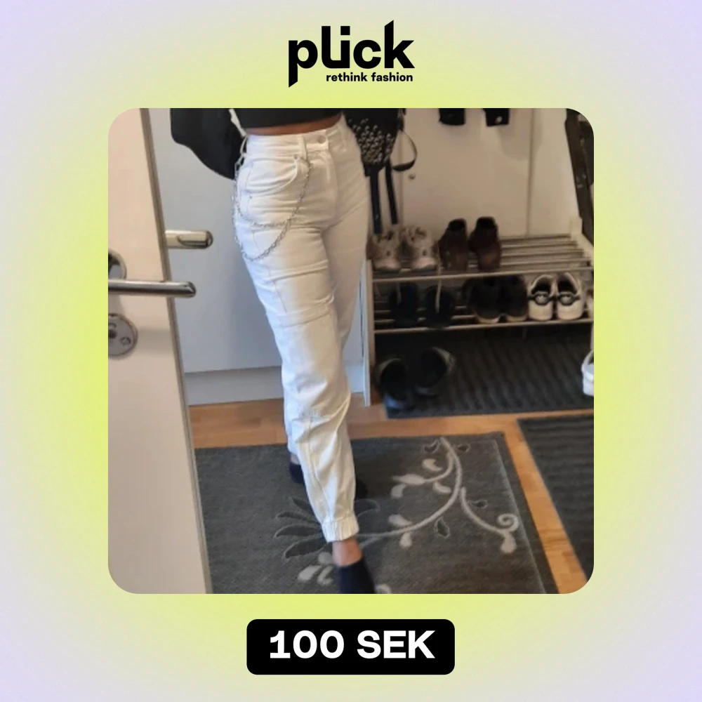 Vita cargobyxor i jeansmaterial. Lite smutsig på insidan vid lappen (bild 3) men går att gnugga bort med medel om man vill. OBS kedjan tillhör EJ. Jag är 155cm.