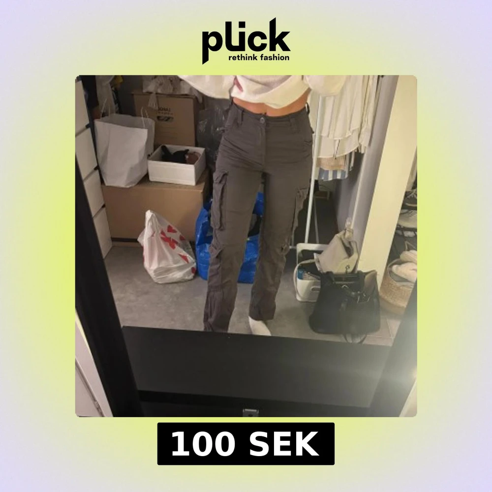 Säljer ett par mörkgråa straight fit cargo byxor från Bershka med hög midja och flera praktiska fickor på sidorna.