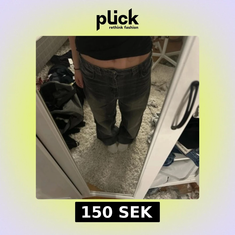 Säljer ett par gråa baggy jeans från Bershka i storlek 38. De har en cool tvättad look med ljusare partier och klassisk femficksmodell. Jeansen har låg midja och raka, lösa ben.