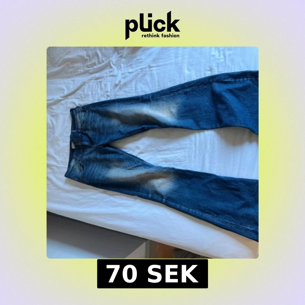 Säljer ett par klassiska blå jeans från Bershka i rakare bootcut fit. Jeansen har snygga slitningar och ljusare partier framtill och baktill för en cool, avslappnad look. De har normal midja, fem fickor och stängs med dubbla knappar och dragkedja. Knappt använda.