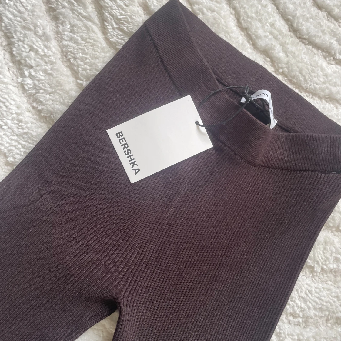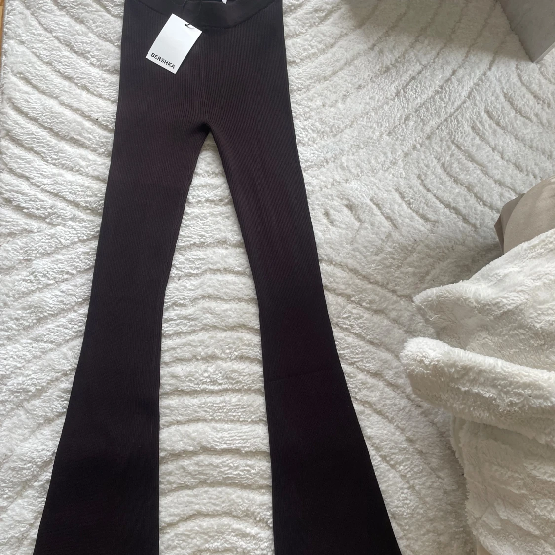 Säljer ett par mörkbruna ribbade byxor från Bershka med utsvängda ben och hög midja. Byxorna är stretchiga och sitter tajt upptill med en snygg bootcut-stil. Storlek S men passar M med då de är extremt stretchiga, passar även dig som är lång då de är långa i benen
