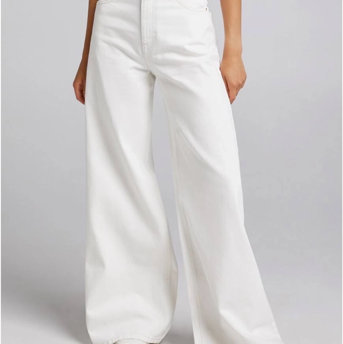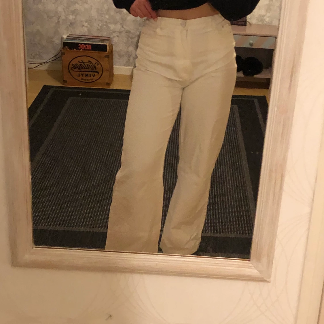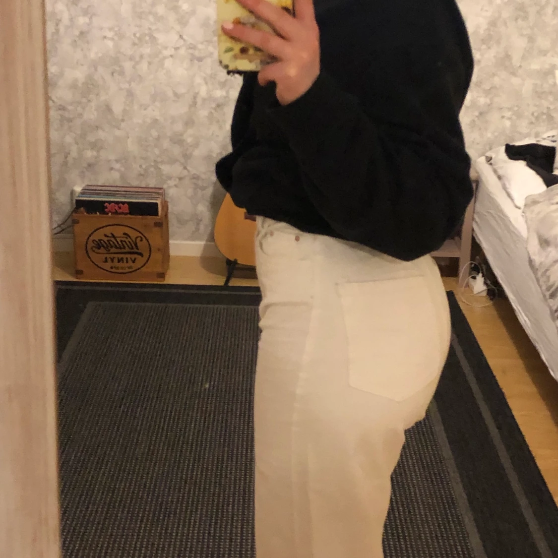 Vita utsvängda jeans med hög midja i storlek 34 från bershka. Nypris: 500kr. Använda fåtal gånger. Jeansen är även uppsydda någon centimeter. OBS! Jeansen på bilden är i strl 38, så ej dessa som säljes, men ett par identiska i annan storlek. Köparen står för frakt men pris kan diskuteras. Kontakta för mer information :)