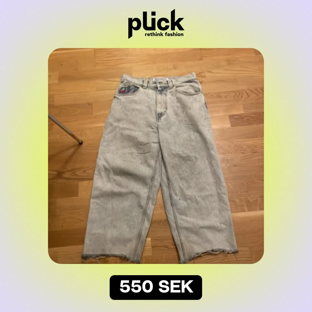 ljus blå big boy jeans S. litet skumt märke på ena sidan av benet. storlek S men benen är lite klippta