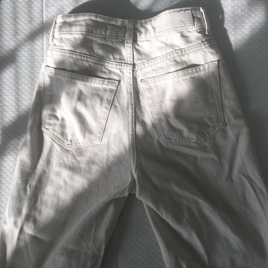 Säljer dessa superfina vita jeans från Bik Bok i storlek 24. De har använts några gånger och har en liten fläck på ena benet, men den syns knappt. De är avklippta för att passa en något kortare person. Köpt för 600 kr men säljer de för 200 kr+ frakt💕