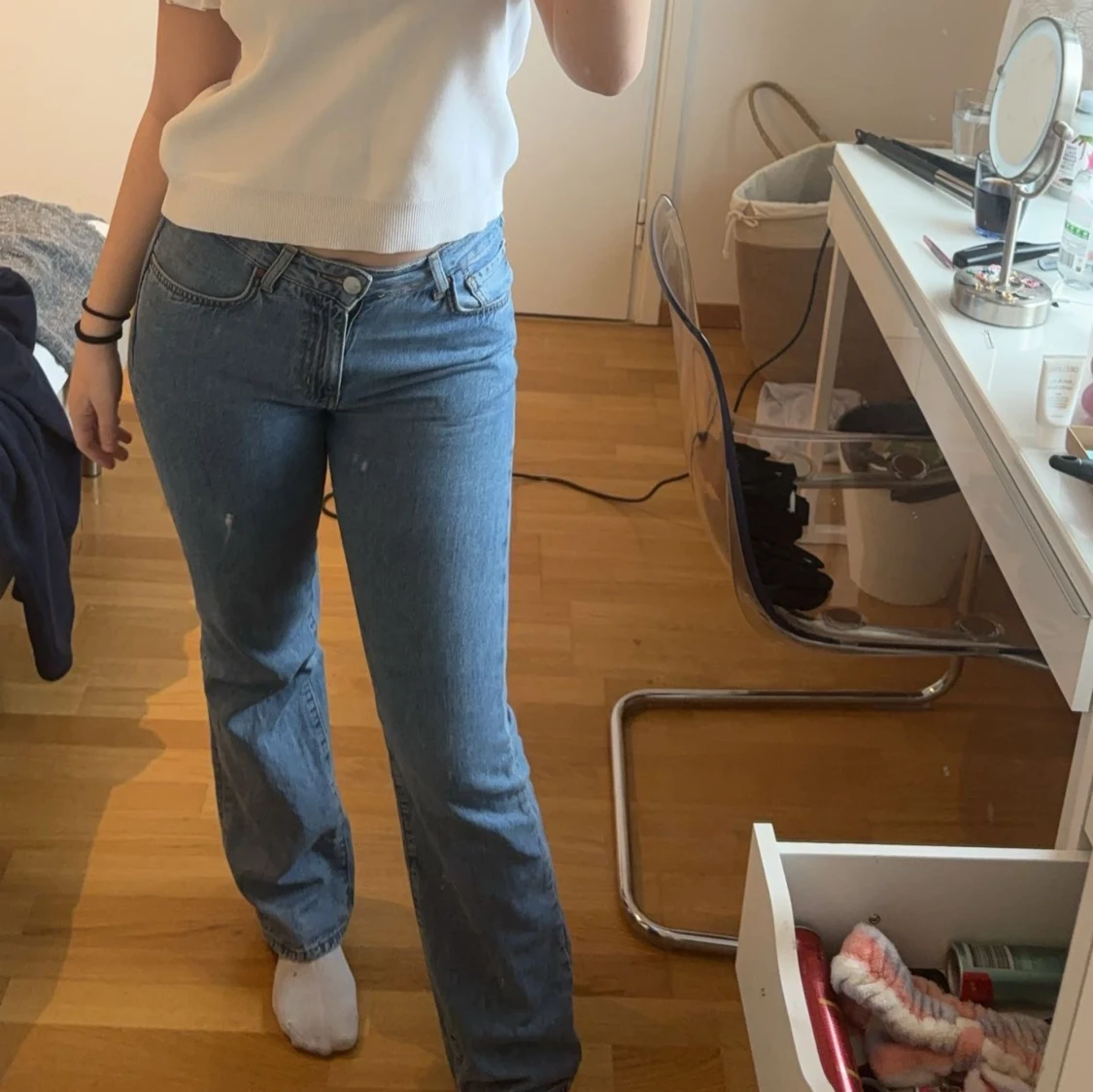 Straight low waist Jeans från Bikbok, andvänd ett par gånger men i fint skick🩷 W28 L32 OBS. Smutsig spegel på bilden jeansen är som nya ! Tryck på köp nu !