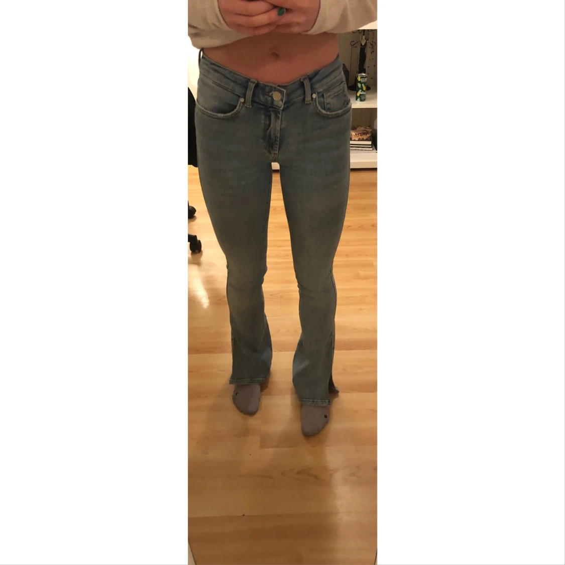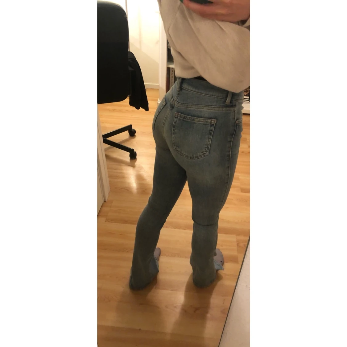Ljusblåa lågmidjade jeans från bikbok. Egen gjord slits på dem, säljer på grund av att de är för små.