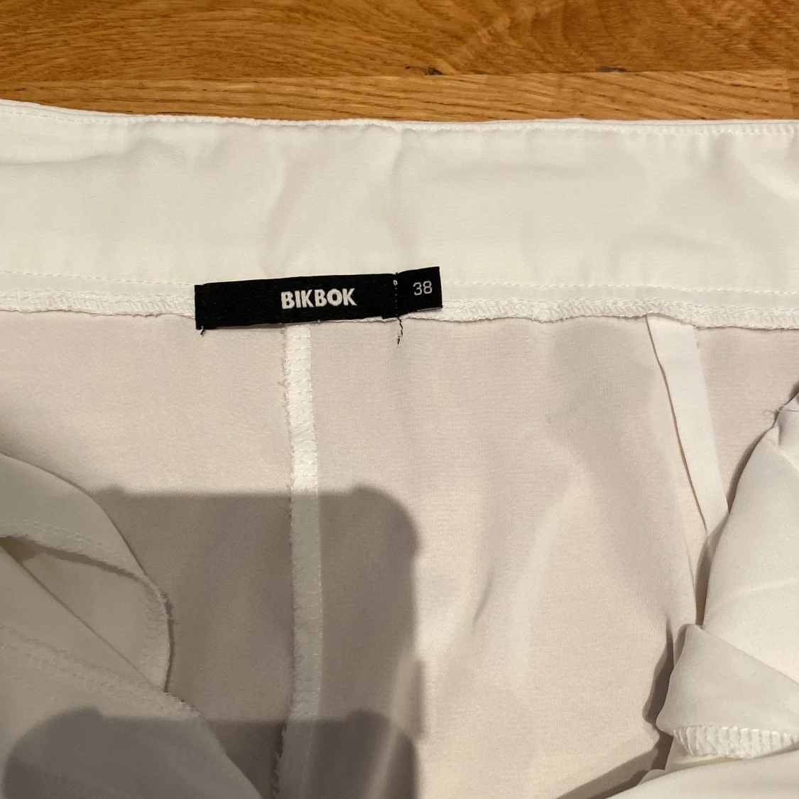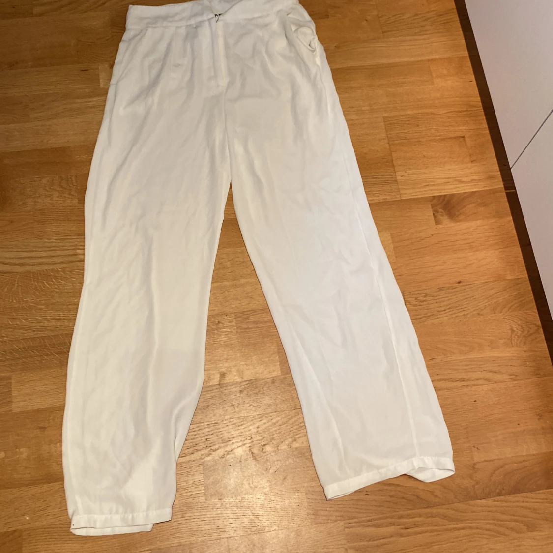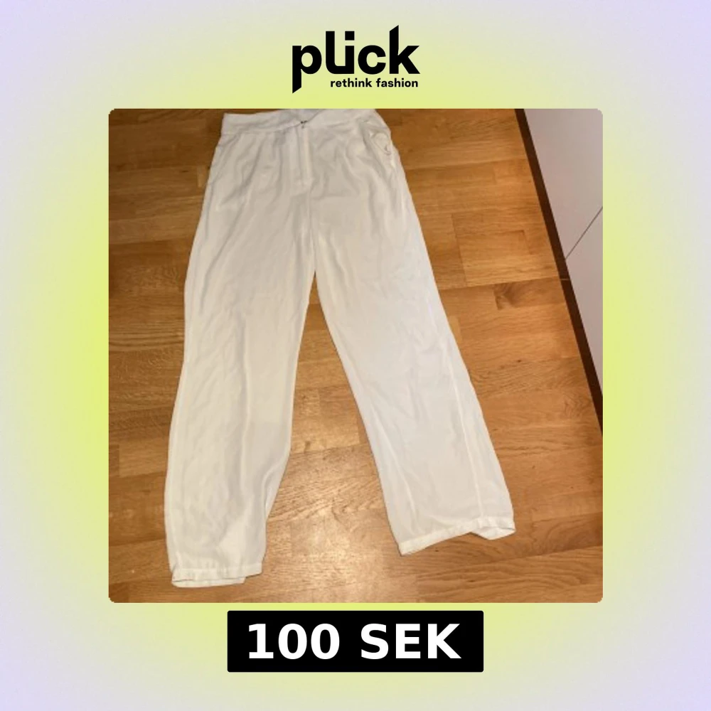 Säljer ett par vita, vida byxor från BikBok i storlek 38. Byxorna har en avslappnad passform med resår i midjan och sidfickor. Perfekta för en chill och stilren look. Materialet känns lätt och luftigt, perfekt för varmare dagar.