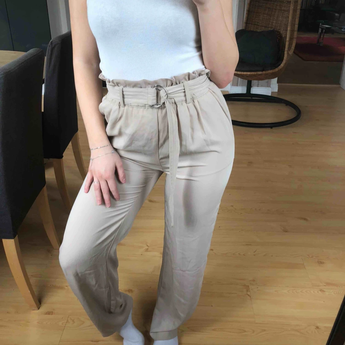 Sandfärgade lösa byxor med raka ben och ett bälte vid midjan. Superfina på! Använda en gång