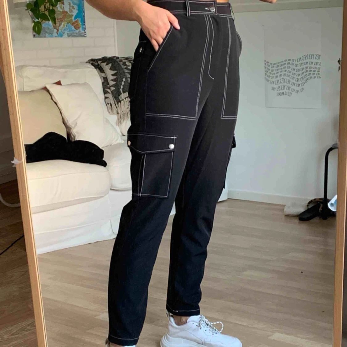 Svarta byxor med vita kontrastsömmar. Använda endast ett par gånger. Finns att hämta i Åkersberga eller frakt 50kr :)