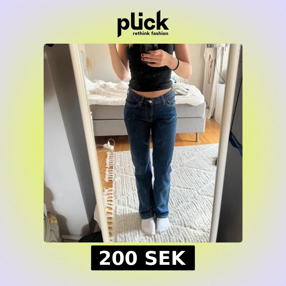 Säljer ett par mörkblå jeans med klassisk rak passform och låg midja.