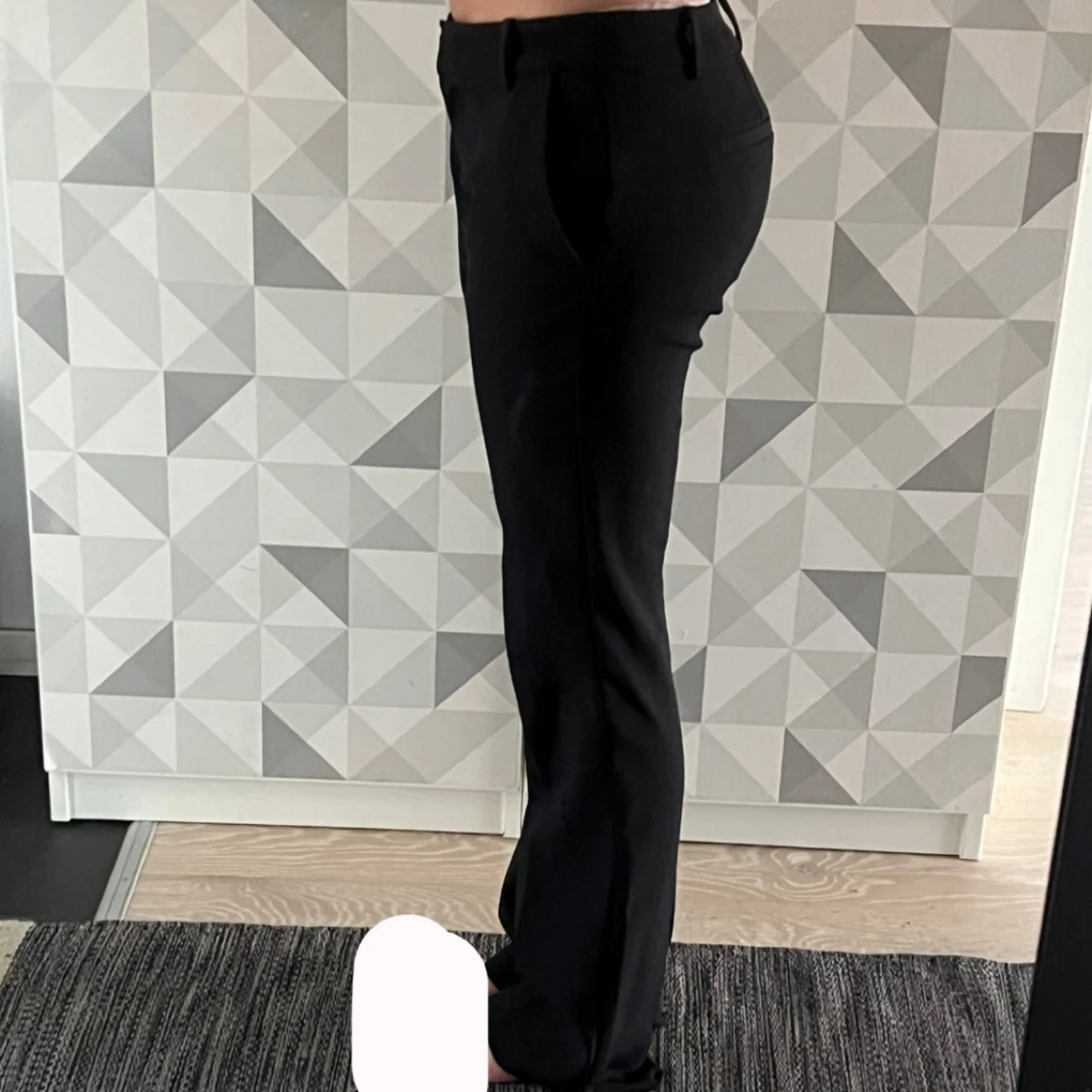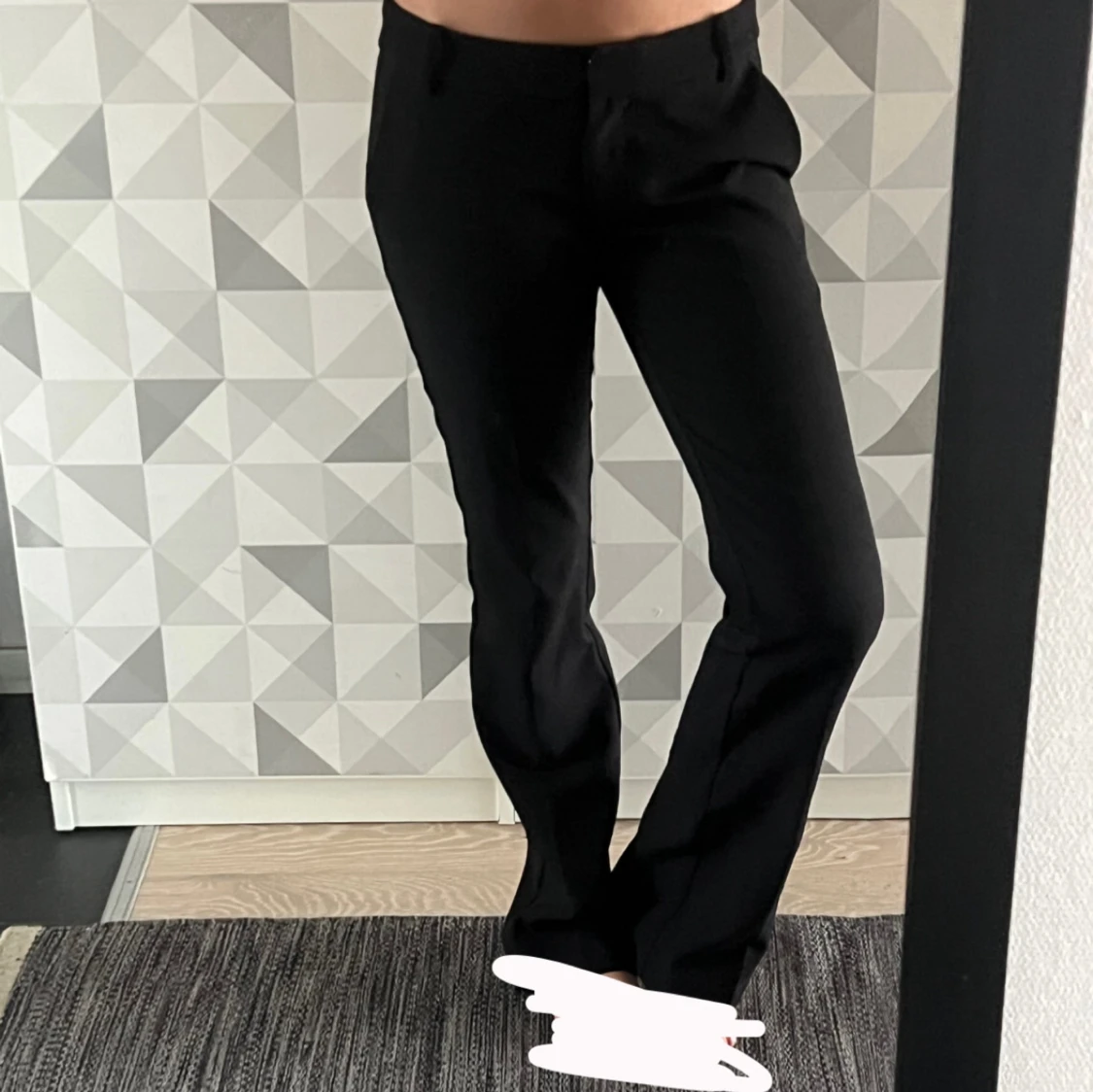 Snygga svarta kostymbyxor med bootcut-silhuett och klassisk passform. Byxorna har hällor för bälte och stängs med dragkedja och knapp. Perfekta för en clean och stilren look. Materialet känns mjukt och följsamt.