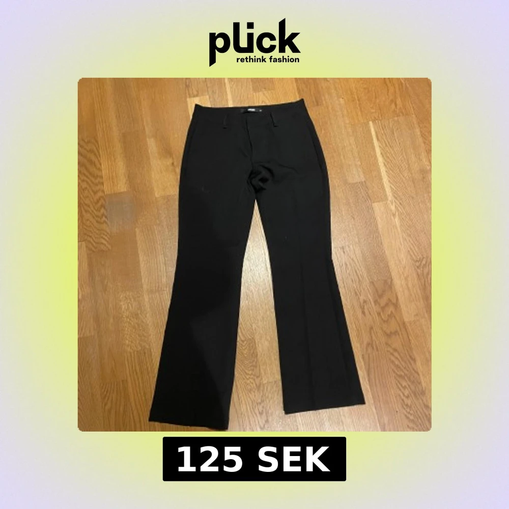 Snygga svarta kostymbyxor från BikBok i storlek 34. Byxorna har en klassisk design med utsvängda ben och en stilren look. Perfekta för en chic och professionell stil. Skriv för frågor🫶🏻